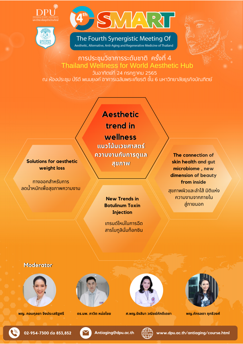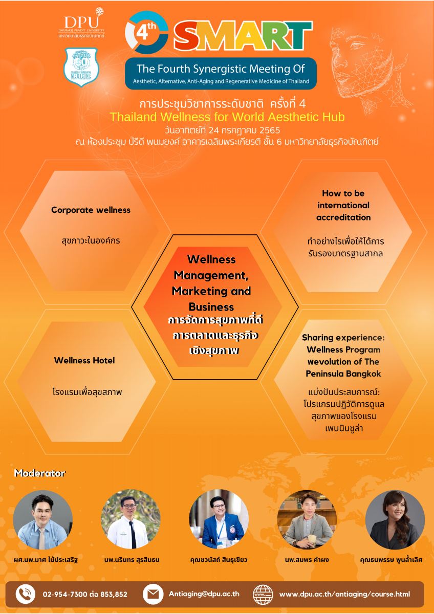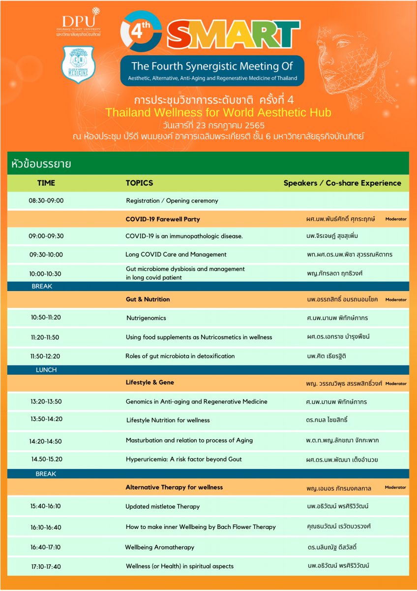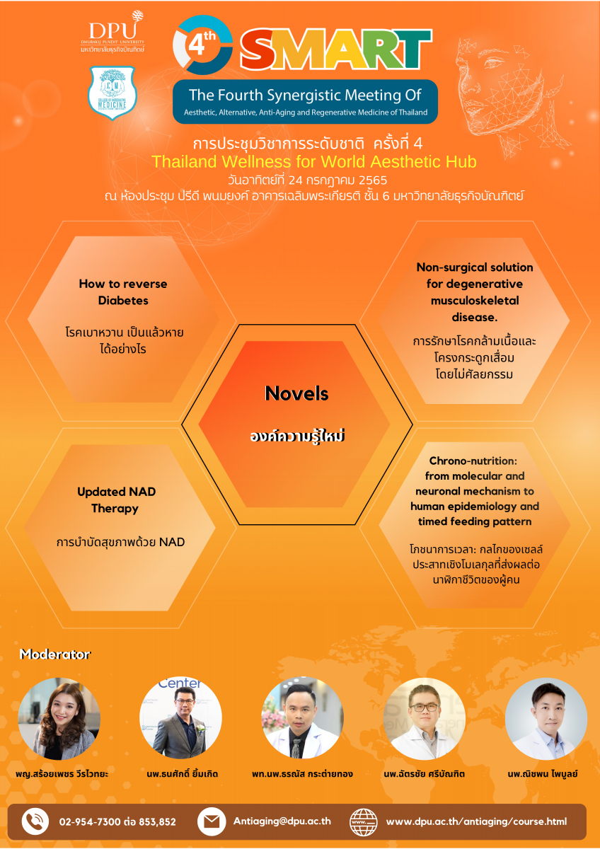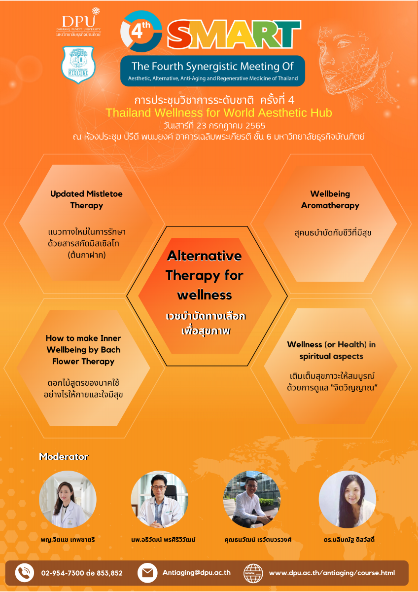 หลักสูตรบัณฑิตศึกษา สาขาวิชาวิทยาการชะลอวัยและฟื้นฟูสุขภาพ วิทยาลัยการแพทย์บูรณาการ มหาวิทยาลัยธุรกิจบัณฑิตย์ จะจัดประชุมวิชาการระดับชาติ ครั้งที่ 4 (4th SMART : The Fourth Synergistic Meeting of Aesthetic, Alternative, Anti-Aging and Regenrative Medicine of Thailand) ขึ้นในวันที่ 23-24 กรกฎาคม 2565 ณ ห้องประชุมปรีดี พนมยงค์ อาคารเฉลิมพระเกียรติ ชั้น 6 มหาวิทยาลัยธุรกิจบัณฑิตย์