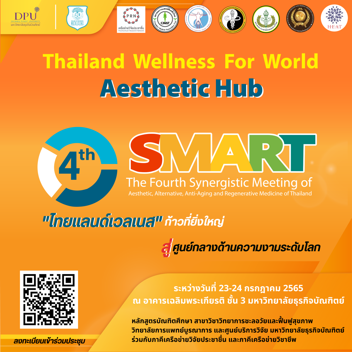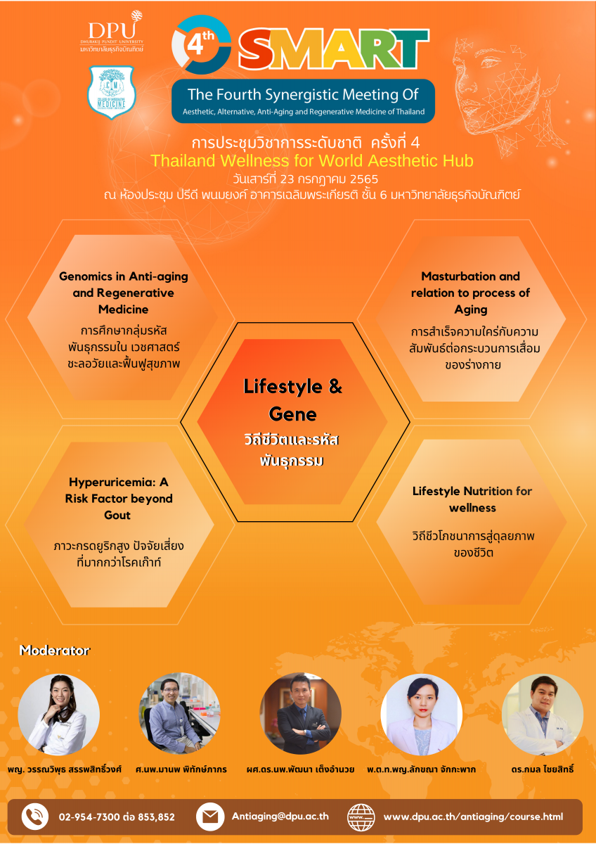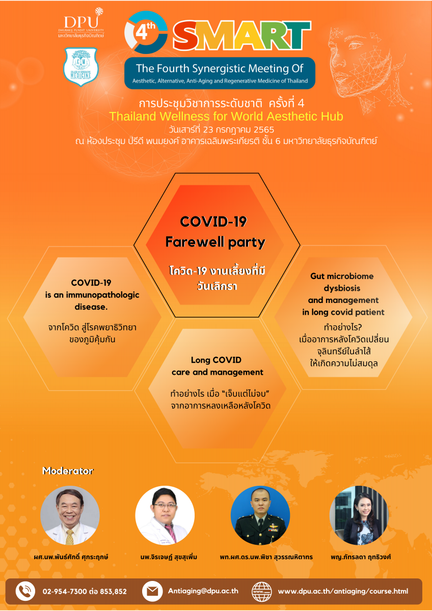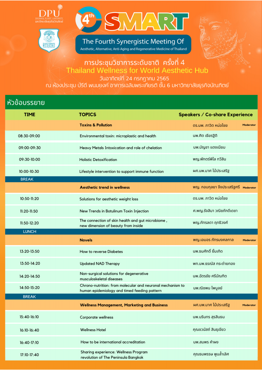หลักสูตรบัณฑิตศึกษา สาขาวิชาวิทยาการชะลอวัยและฟื้นฟูสุขภาพ วิทยาลัยการแพทย์บูรณาการ มหาวิทยาลัยธุรกิจบัณฑิตย์ จะจัดประชุมวิชาการระดับชาติ ครั้งที่ 4 (4th SMART : The Fourth Synergistic Meeting of Aesthetic, Alternative, Anti-Aging and Regenrative Medicine of Thailand) ขึ้นในวันที่ 23-24 กรกฎาคม 2565 ณ ห้องประชุมปรีดี พนมยงค์ อาคารเฉลิมพระเกียรติ ชั้น 6 มหาวิทยาลัยธุรกิจบัณฑิตย์