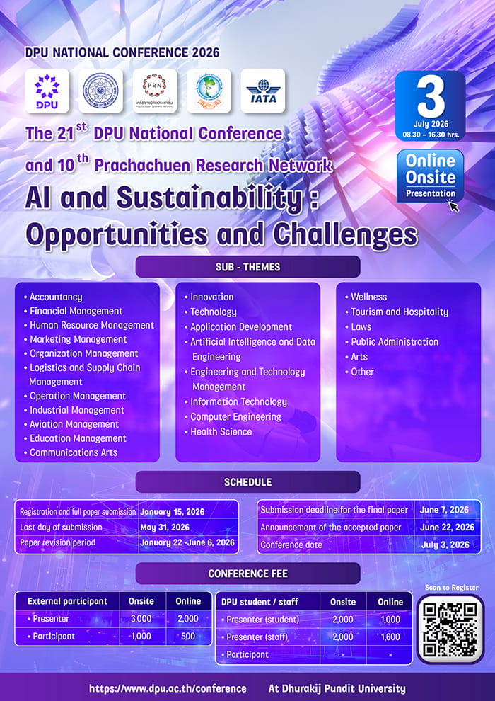 สายงานวิจัยและพัฒนา มหาวิทยาลัยธุรกิจบัณฑิตย์ ซึ่งมีภารกิจในการส่งเสริมและสนับสนุนการทำวิจัย ภายใต้ DPU Research Themes ซึ่งมุ่งเน้นด้านนวัตกรรมและเป้าหมายการพัฒนาอย่างยั่งยืน (Sustainable Development Goals : SDGs) จึงได้จัดให้มีการประชุมวิชาการระดับชาติ มธบ. ครั้งที่ 21 และเครือข่ายวิจัยประชาชื่น ครั้งที่ 10 ในหัวข้อ “AI and Sustainability: Opportunities and Challenges ปัญญาประดิษฐ์และความยั่งยืน: โอกาสและความท้าทาย” โดยเปิดรับบทความวิจัยที่ประสงค์จะส่งเข้าร่วมใน 3 กลุ่มสาขาวิชาได้แก่ 1) การบัญชี บริหารธุรกิจ การบิน การศึกษา และนิเทศศาสตร์ 2) นวัตกรรม เทคโนโลยี และวิทยาศาสตร์สุขภาพ 3) ความเป็นอยู่ที่ดี การท่องเที่ยว กฎหมาย และรัฐประศาสนศาสตร์ และอื่นๆ ผู้เข้าร่วมสามารถนำความรู้จากการประชุมวิชาการครั้งนี้ไปประยุทธ์ใช้หรือต่อยอดในการพัฒนาองค์กรด้านนวัตกรรมและความยั่งยืนได้ต่อไปในอนาคต