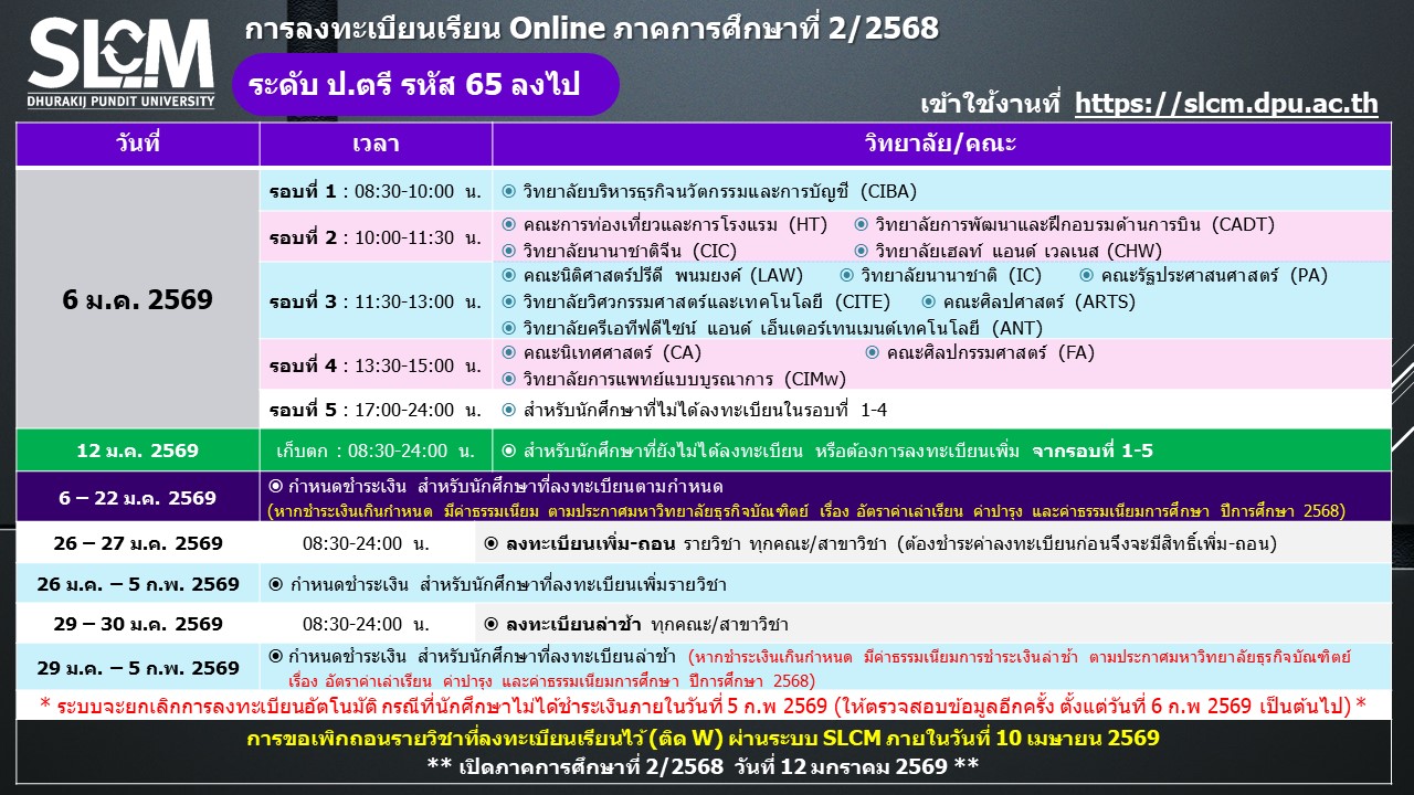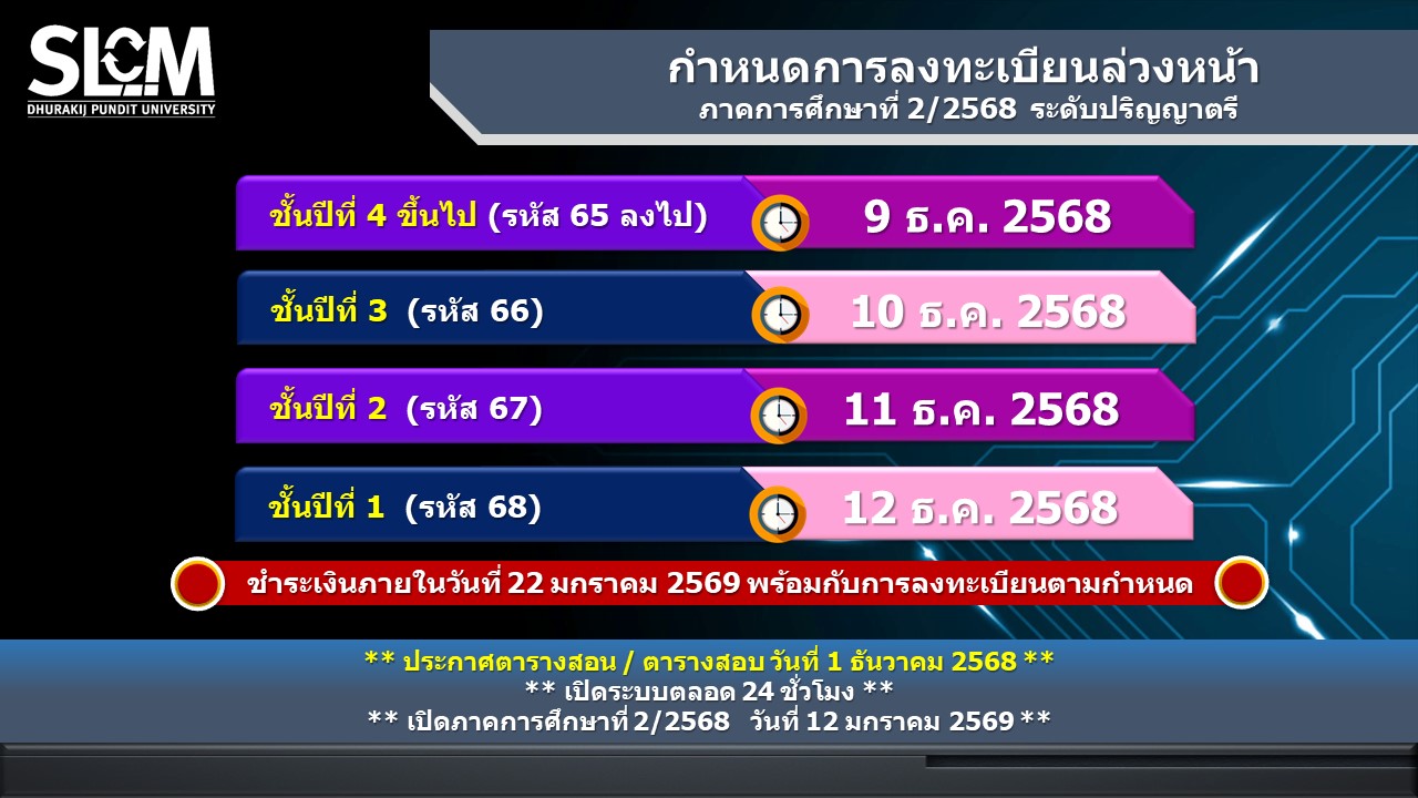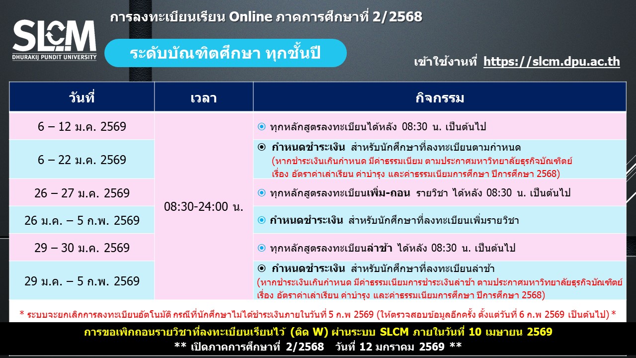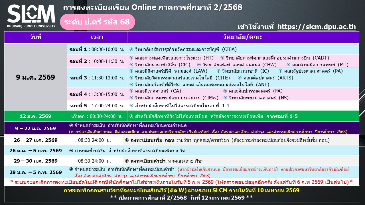 กำหนดการลงทะเบียน ภาคการศึกษาที่ 2 ปีการศึกษา 2568