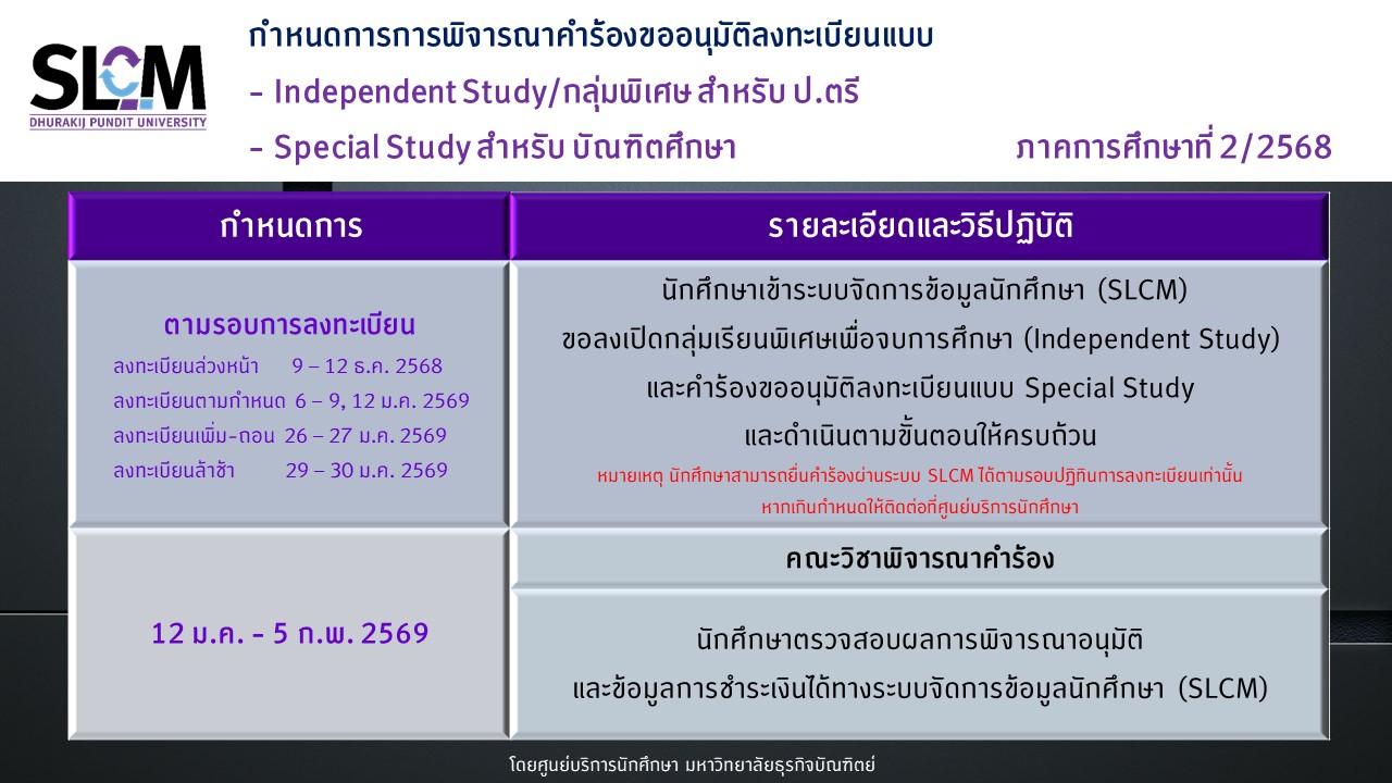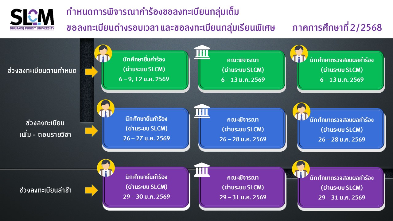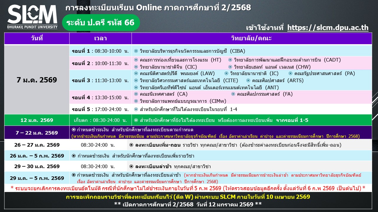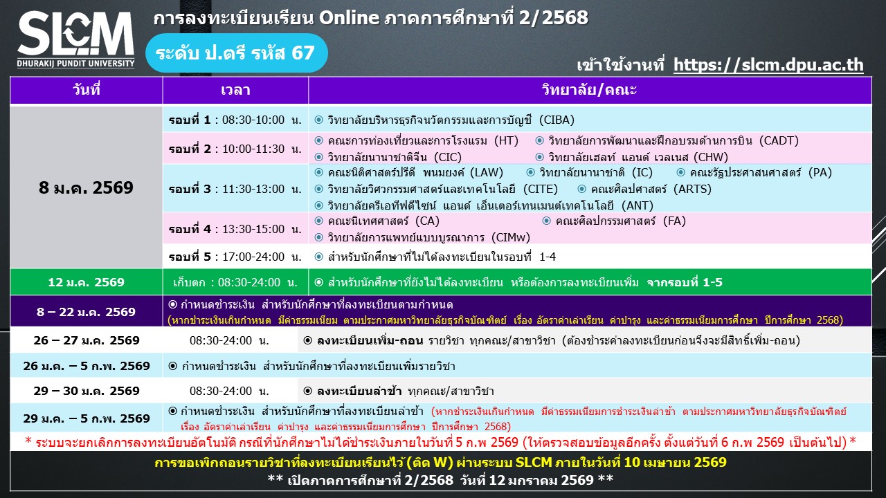 กำหนดการลงทะเบียน ภาคการศึกษาที่ 2 ปีการศึกษา 2568
