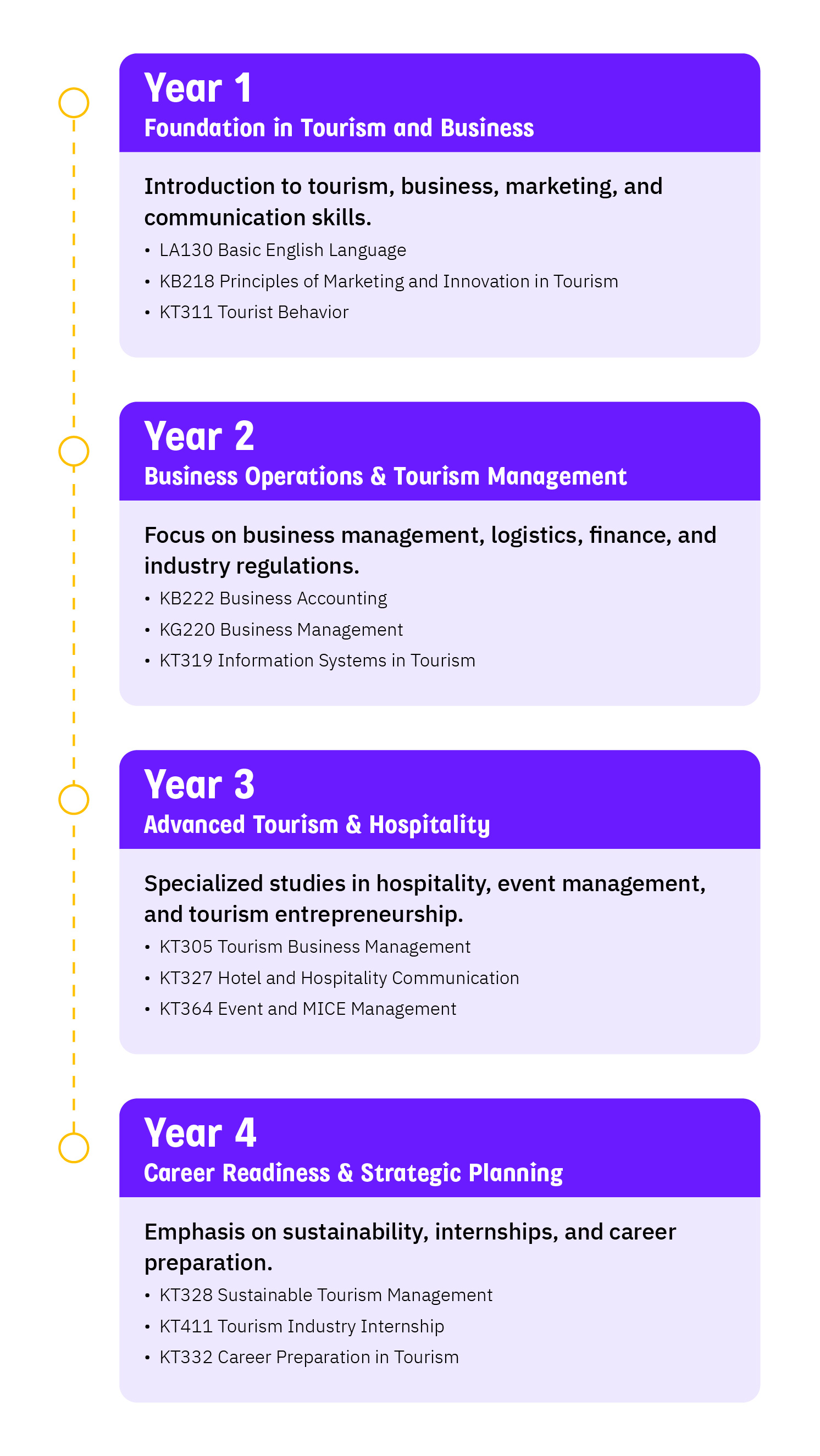 The B.B.A. in Tourism Management is designed to prepare students for global careers in the tourism and hospitality industry through a modern, practice-oriented curriculum. It develops expertise in sustainable tourism, strategic planning, and destination management, equipping students with the skills to create innovative and meaningful travel experiences.