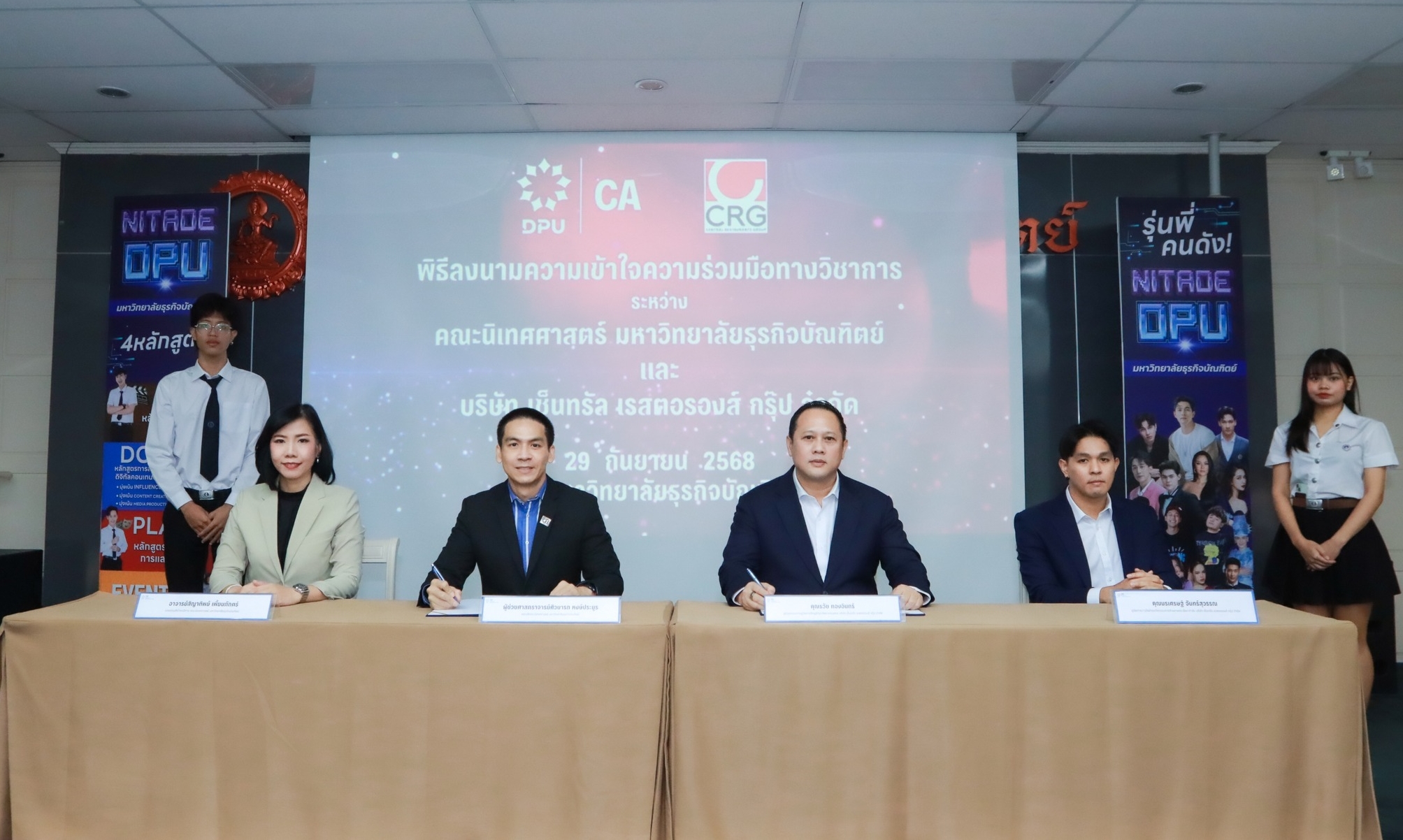 คณะนิเทศศาสตร์ มหาวิทยาลัยธุรกิจบัณฑิตย์ (DPU) จัดพิธีลงนามบันทึกความร่วมมือทางวิชาการ (MOU) กับบริษัท เซ็นทรัล เรสตอรองส์ กรุ๊ป จำกัด (CRG) หนึ่งในผู้นำธุรกิจร้านอาหารของประเทศ เพื่อสร้างระบบนิเวศการเรียนรู้ที่เชื่อมโยงภาคทฤษฎีเข้ากับการปฏิบัติในภาคอุตสาหกรรมโดยตรง และพัฒนาบัณฑิตให้มีศักยภาพรอบด้านในยุคดิจิทัล เมื่อวันที่ 29 กันยายน 2568 ณ ห้องประชุมทวี บุณยเกตุ