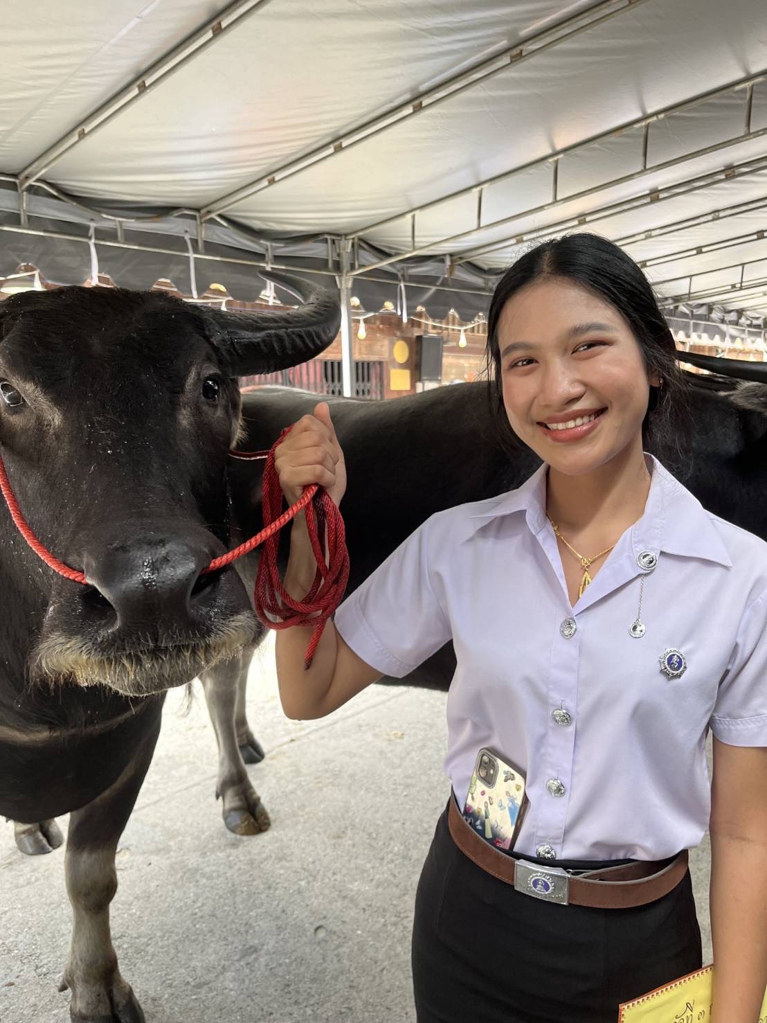 เธออยู่ในชุดนักศึกษา เดินจูงควายตัวยักษ์เข้าสังเวียนด้วยท่าทีทะมัดทะแมง ดูเชี่ยวชาญการดูแลสัตว์ ไม่แพ้ออร่าที่สดใส