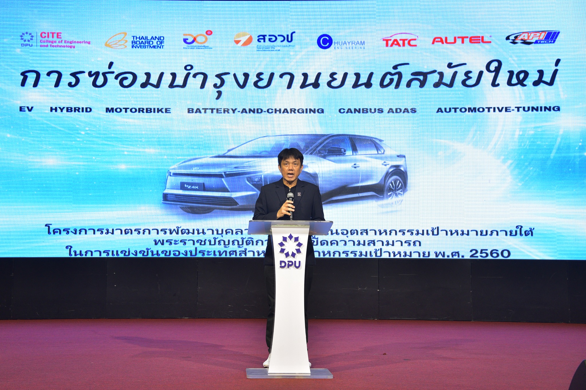 ด้าน ผศ.ดร.ชัยพร กล่าวว่า ในอีกไม่นาน สัดส่วนการใช้งานรถยนต์สันดาปภายใน รถยนต์ EV และรถยนต์ไฮบริดในประเทศไทยน่าจะมีสัดส่วนใกล้เคียงกัน และสัดส่วนของรถยนต์ EV และไฮบริดรวมกันจะมากกว่ารถยนต์สันดาปภายในอย่างแน่นอน สะท้อนถึงการเปลี่ยนผ่านของอุตสาหกรรมที่กำลังเกิดขึ้นอย่างต่อเนื่อง บทบาทของ CITE DPU ซึ่งมีการเปิดสอนหลักสูตรระดับปริญญาตรี สาขาวิศวกรรมยานยนต์สมัยใหม่ ซึ่งมีทั้งเครือข่ายผู้ประกอบการ ผู้ผลิต เช่น วิทยาลัยเทคโนโลยียานยนต์โตโยต้า Autel AU-EV API-Tech และบุคลากรที่มีศักยภาพในการสนับสนุนผู้ประกอบการและบุคลากรในอุตสาหกรรมยานยนต์ให้สามารถปรับตัวต่อการเปลี่ยนผ่านของเทคโนโลยีจากยานยนต์เครื่องยนต์สันดาปภายในไปสู่ยานยนต์ไฟฟ้าและยานยนต์ไฮบริดได้ ซึ่งมีเทคโนโลยีใหม่ๆ เข้ามาเกี่ยวข้องมากขึ้น จำเป็นต้องมีการยกระดับองค์ความรู้และทักษะใหม่ ๆ โดยเฉพาะการเสริมองค์ความรู้และการใช้เครื่องมือวิเคราะห์ในการตรวจสอบและซ่อมบำรุง หลักสูตรการอบรมครั้งนี้ ได้ออกแบบให้มีทั้งภาคทฤษฎีและปฏิบัติ โดยผู้เข้าร่วมอบรมจะได้รับทักษะด้านการบำรุงรักษายานยนต์สมัยใหม่ เช่น รถยนต์ไฟฟ้า รถยนต์ไฮบริด ระบบแบตเตอรี่และการชาร์จ รวมถึงการทำงานของระบบอัจฉริยะในยานยนต์ที่มีการควบคุมผ่านระบบสมองกลและซอฟต์แวร์ต่าง ๆ เพื่อให้ผู้เข้าร่วมอบรมสามารถนำความรู้ไปประยุกต์ใช้ได้จริง การที่ผู้ประกอบการได้เพิ่มพูนทักษะในการวิเคราะห์และเครื่องมือจะทำให้ช่วยยกระดับมาตรฐานการให้บริการของผู้ประกอบการในอุตสาหกรรมมีมาตรฐานใกล้เคียงกันมากขึ้น