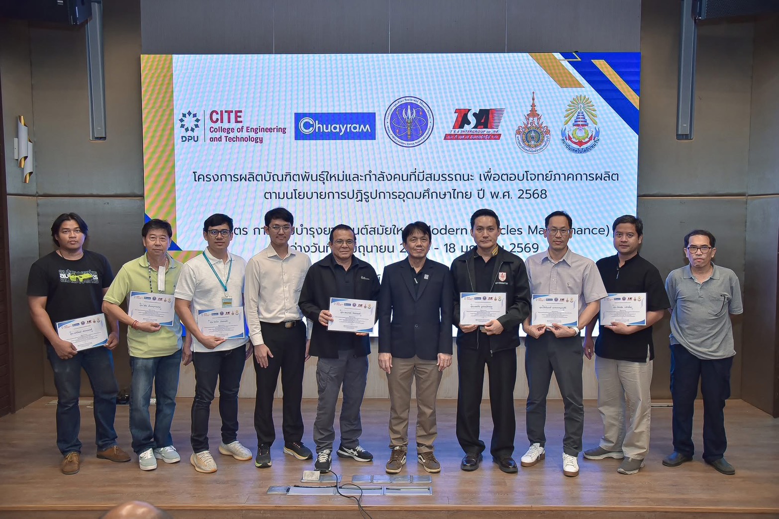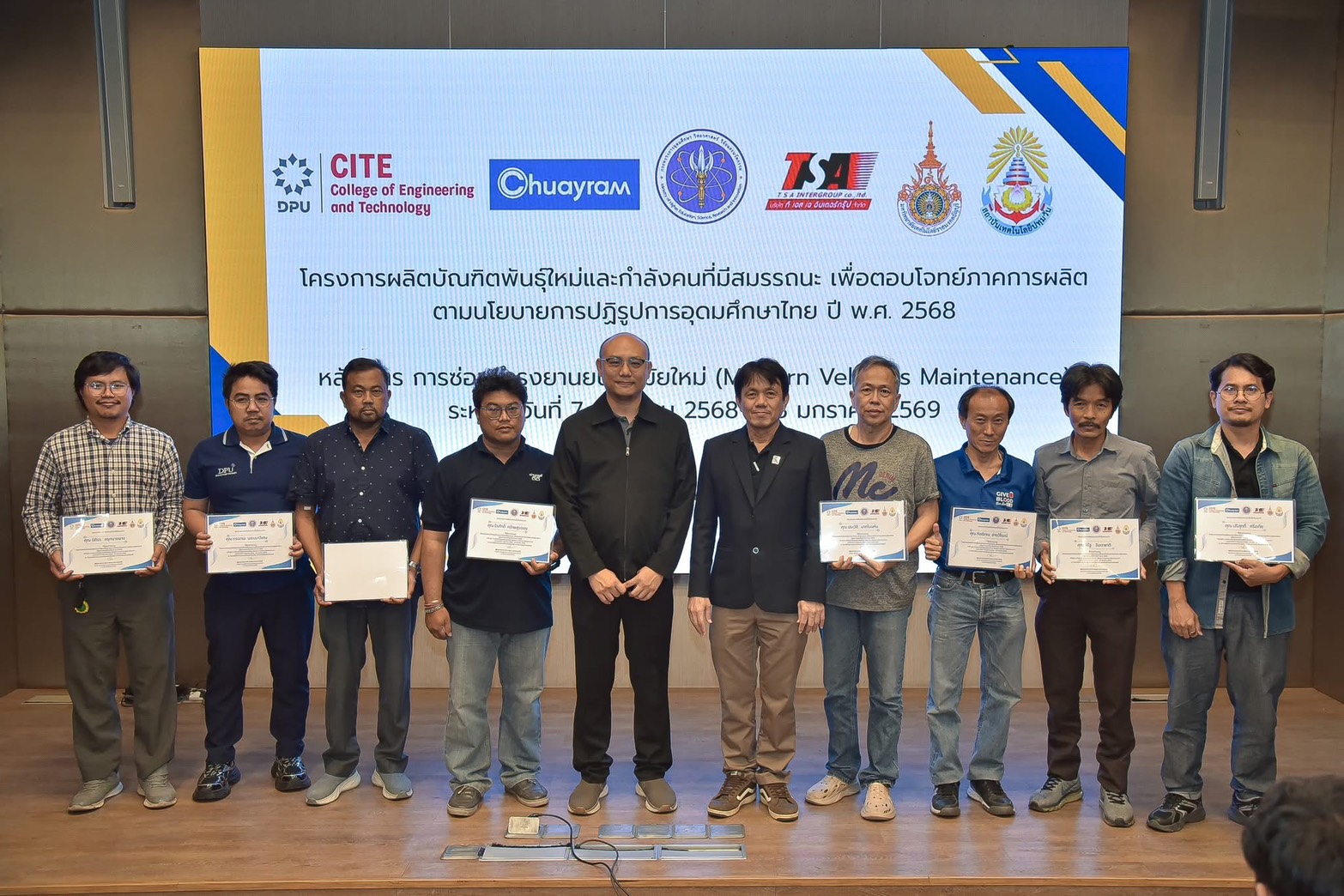 มหาวิทยาลัยธุรกิจบัณฑิตย์ (DPU) โดยวิทยาลัยวิศวกรรมศาสตร์และเทคโนโลยี (CITE) จัดพิธีปิดโครงการบัณฑิตพันธุ์ใหม่ หลักสูตร “การซ่อมบำรุงยานยนต์สมัยใหม่” เมื่อวันที่ 18 มกราคม 2569 ณ ห้องประชุมสัจจา เกตุทัต เพื่อสรุปผลการพัฒนากำลังคนสมรรถนะสูงป้อนกลุ่มอุตสาหกรรมเครื่องยนต์อัจฉริยะ (New Growth Engine) หลังดำเนินงานบ่มเพาะทักษะวิชาชีพอย่างเข้มข้นตลอดระยะเวลา 7 เดือน ตั้งแต่เดือนมิถุนายน 2568 ที่ผ่านมา โดยมีผู้เข้าร่วมและผ่านการอบรมจำนวนทั้งสิ้น 60 คน