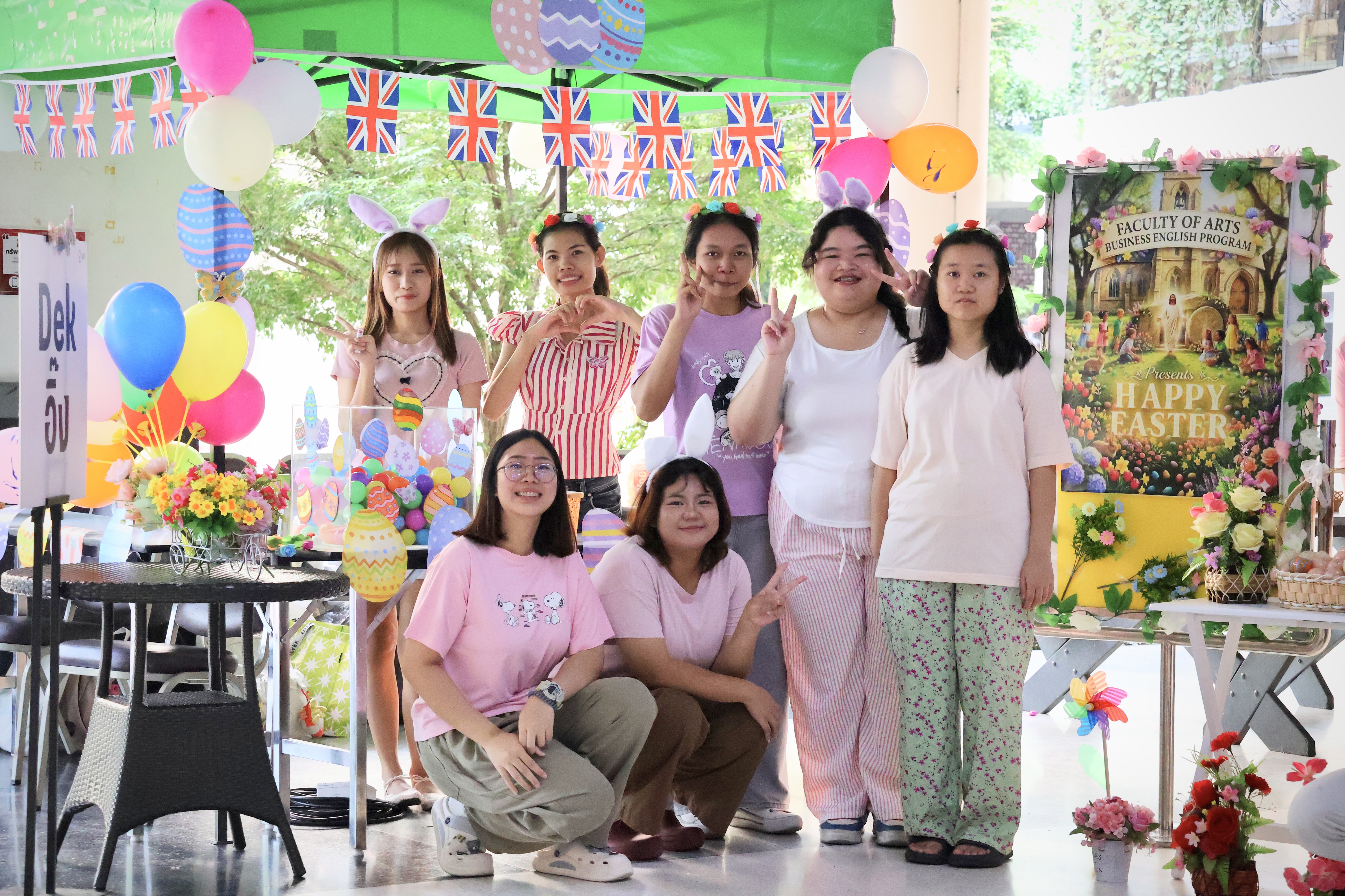 เช่นเดียวกับ นางสาวเสาวลักษณ์ แซ่โจว และ นางสาวณัฐชา เอี่ยมท้วม นักศึกษาชั้นปีที่ 2 หลักสูตรภาษาอังกฤษธุรกิจ คณะศิลปศาสตร์ เปิดเผยว่า กลุ่มของตนได้ออกแบบกิจกรรมภายใต้ธีม “อีสเตอร์” โดยจัดทำป้ายเล่าเรื่องราวของเทศกาลอีสเตอร์บริเวณหน้าบูท เพื่อให้ผู้เข้าร่วมเข้าใจบริบทก่อนร่วมกิจกรรม ภายในบูทมีกิจกรรมหลากหลาย อาทิ การสุ่มหยิบไข่เพื่อทำกิจกรรม การระบายสีในโซนพักผ่อน และเกมส่งต่อไข่โดยใช้ช้อนเดินวนรอบเก้าอี้ โดยกระบวนการทำงานเริ่มจากอาจารย์ให้แนวทางและตัวอย่าง ก่อนที่นักศึกษาจะร่วมกันพัฒนาไอเดีย วางแผน และแบ่งหน้าที่กันอย่างชัดเจน ทั้งการตกแต่งพื้นที่ เป่าลูกโป่ง และเตรียมอุปกรณ์ต่าง ๆ