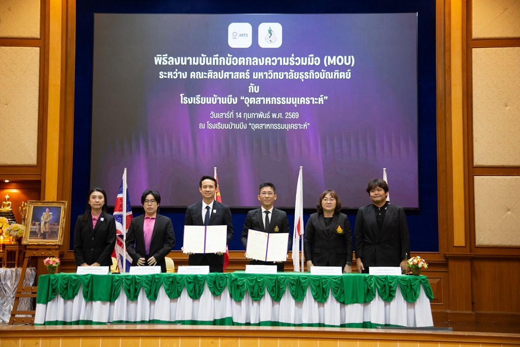 การลงนามบันทึกข้อตกลงความร่วมมือทางวิชาการ (MOU) ครั้งนี้มีคณะผู้บริหารจากทั้งสองสถาบันเข้าร่วมอย่างพร้อมเพรียง โดยฝ่ายคณะศิลปศาสตร์ DPU นำโดย ดร.วริศ ลิ้มลาวัลย์ คณบดี พร้อมด้วย ดร.โชติกานต์ จิราลักษณ์สกุล รองคณบดี และอาจารย์สุรีรัตน์ ณิชาพัฒน์ ขณะที่ฝ่ายโรงเรียนบ้านบึง “อุตสาหกรรมนุเคราะห์” นำโดย ดร.รุ่งทวี พรรณา ผู้อำนวยการสถานศึกษา และอาจารย์รุศดา บุญกระพือ รองผู้อำนวยการ ร่วมลงนาม ณ อาคารหอประชุม โรงเรียนบ้านบึง “อุตสาหกรรมนุเคราะห์”