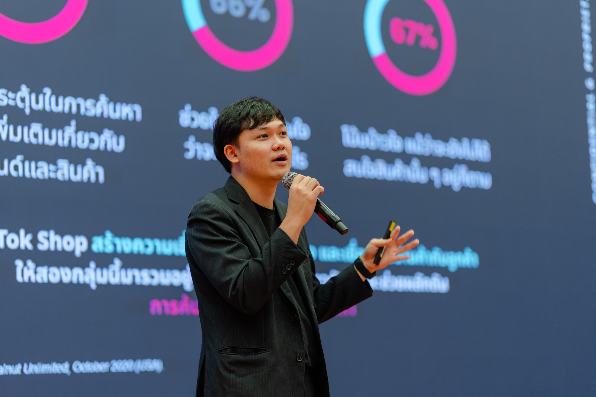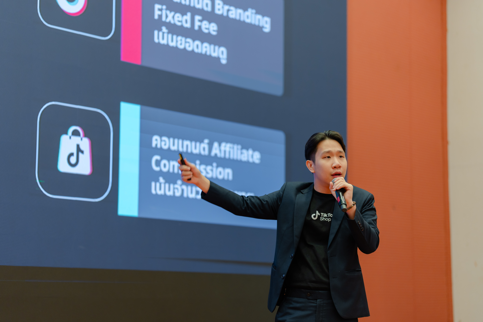 ขณะที่ถัดมาในช่วงบ่าย นายธนกิตต์ ดีประเสริฐ Partnership Academic Associate และ นายพริษฐ์ วีรชัยภักดี Account Manager – Fashion Team จาก TikTok Shop ได้ลงลึกถึงระบบ Affiliate Program 101 และกลยุทธ์ Shoppertainment ซึ่งเป็นการรวมความบันเทิงเข้ากับการตัดสินใจซื้อสินค้าได้อย่างไร้รอยต่อ โดยระบุว่าคอนเทนต์แนวป้ายยาสามารถกระตุ้นการค้นหาแบรนด์ได้สูงถึงร้อยละ 74 และช่วยให้เกิดการตัดสินใจซื้อได้ง่ายขึ้นถึงร้อยละ 66 ผ่านระบบตะกร้าสินค้าที่เชื่อมต่อกับวิดีโอสั้นและการไลฟ์สตรีมที่ผู้บริโภคกำลังรับชมอยู่ในขณะนั้น