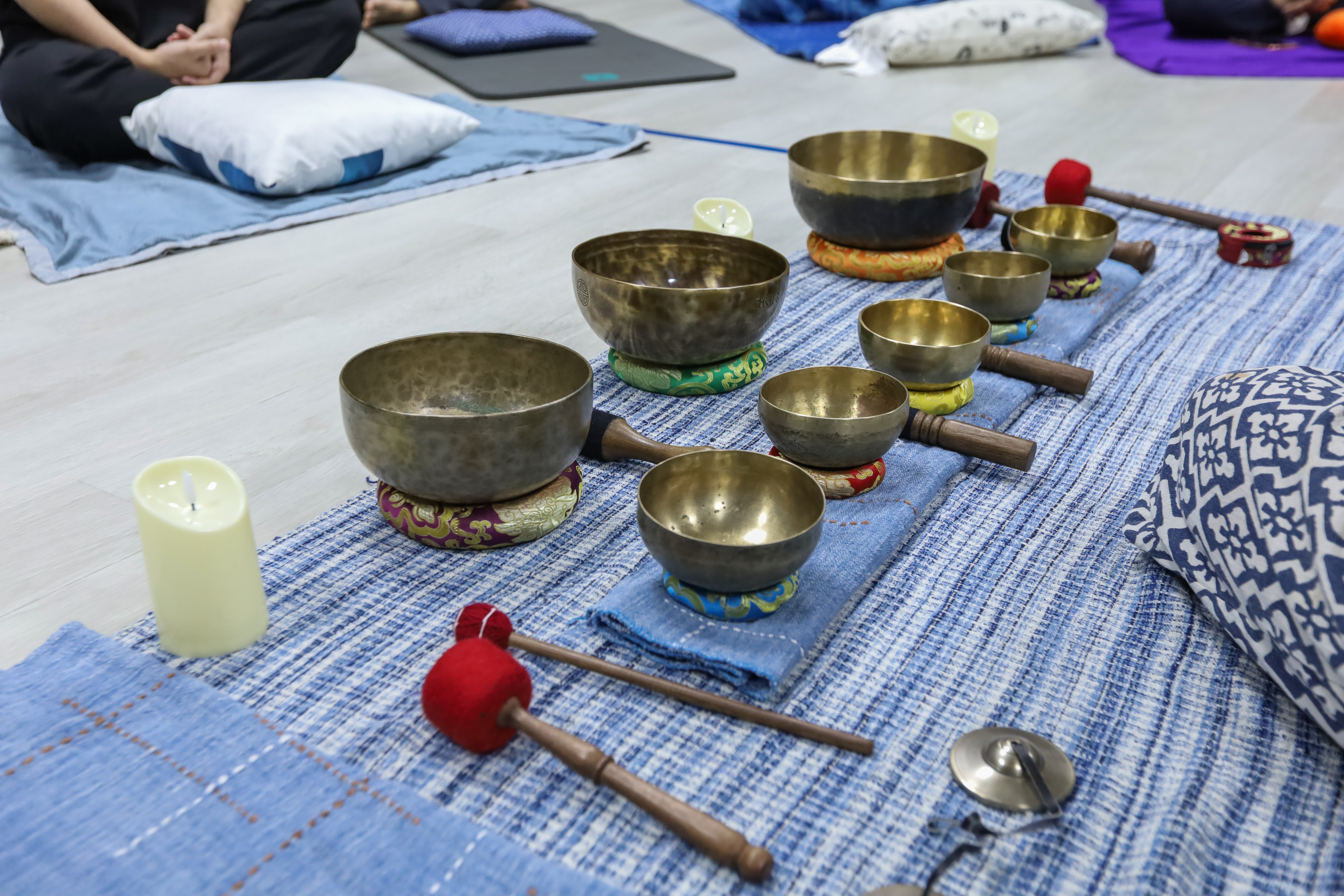 ภายในกิจกรรมใช้เวลาประมาณ 3 ชั่วโมง เริ่มต้นด้วยการฝึกกำหนดลมหายใจ (Breathing Awareness) เพื่อปรับสมาธิให้สัมพันธ์กับจิตใจ โดยมี อาจารย์สุรีรัตน์ ณิชาพัฒน์ รองคณบดีฝ่ายกิจการนักศึกษา คณะศิลปศาสตร์ DPU เป็นผู้นำ โดยให้ผู้เข้าร่วมค่อย ๆ หายใจเข้าออกผ่านทางจมูกอย่างช้า ๆ เพื่อให้ร่างกายและจิตใจเข้าสู่ภาวะสงบ ก่อนเข้าสู่ช่วงหลักของการ บำบัดด้วยเสียงขันทิเบต (Tibetan Singing Bowl Sound Healing) โดย ครูเม – รตนกรณ์ สุประดิษฐ์ นักบำบัดด้วยคลื่นเสียงผู้เชี่ยวชาญ ซึ่งได้บรรเลงเสียงขันทิเบตหลากหลายขนาด เพื่อสร้างคลื่นความถี่และแรงสั่นสะเทือนที่ส่งผ่านสู่ร่างกาย เสียงแต่ละจังหวะช่วยให้ระบบประสาทส่วนกลางได้ผ่อนคลายถึงระดับลึก (Deep Relaxation) และปรับคลื่นสมองให้อยู่ในภาวะสมดุลระหว่างความตื่นตัวและความสงบ