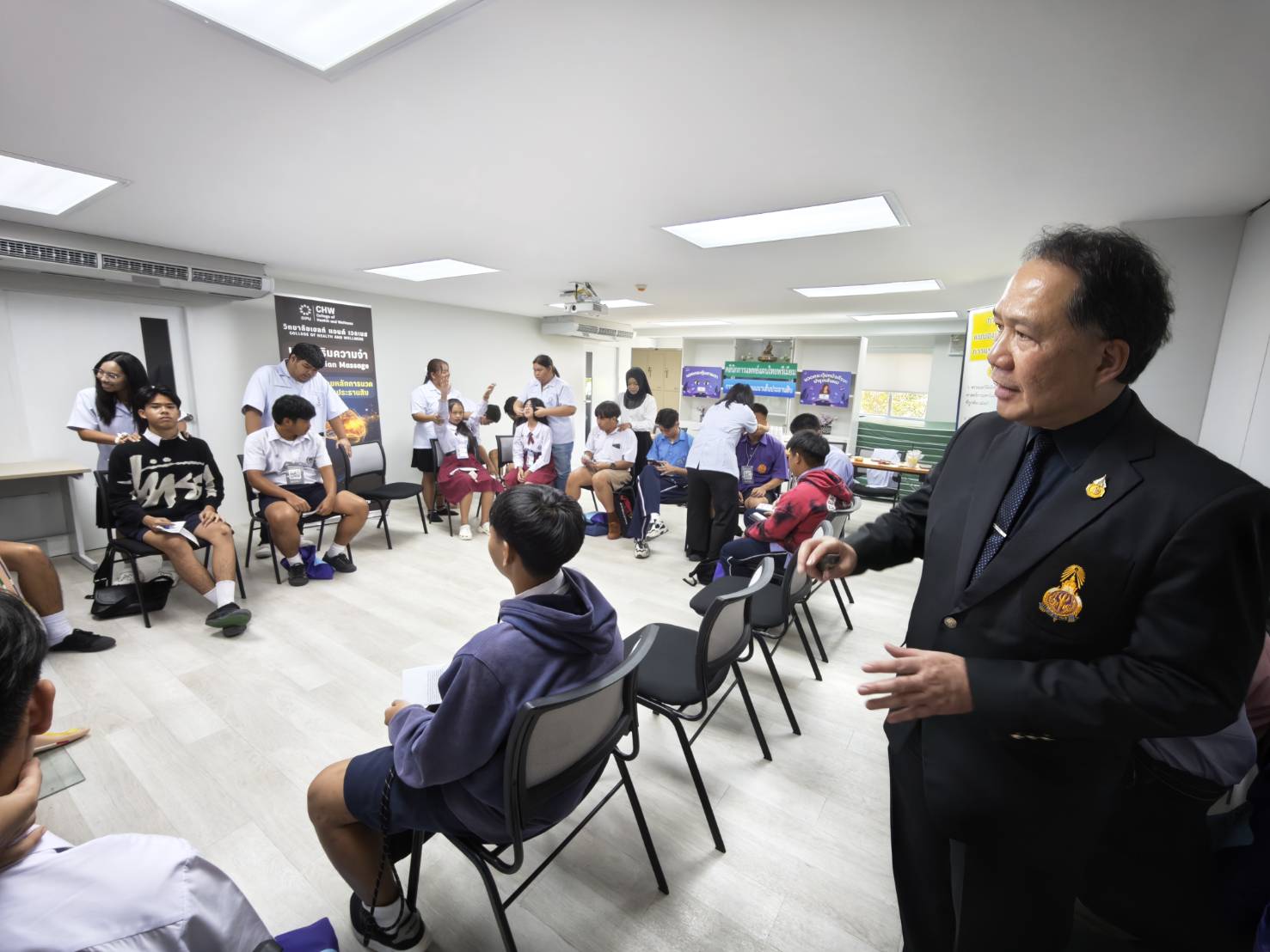 อีกด้านหนึ่ง วิทยาลัยเฮลท์ แอนด์ เวลเนส เปิดสองโซนกิจกรรมหลัก โดยโซนแรกที่อาคาร 7 นำเสนอผลิตภัณฑ์ชาชะลอวัยทั้ง 7 สูตร พร้อมบริการนวดเสริมสุขภาพสมอง (Smart Brain) และการนวดตามแนวเส้นประธานสิบ โดยมีนักศึกษาปี 1 ร่วมสาธิตและให้คำแนะนำเกี่ยวกับหลักสูตรแพทย์แผนไทย ตั้งแต่กระบวนการตรวจวินิจฉัย การรักษา ไปจนถึงแนวคิดพื้นฐานของศาสตร์สุขภาพแบบองค์รวม โดยเน้นดูแลคณาจารย์จากโรงเรียนต่าง ๆ ที่มาร่วมงาน ส่วนอาคาร 10 มีกิจกรรมฐานเวชกรรมและการตรวจวินิจฉัย ฐานน้ำสมุนไพร 3 สูตร และฐานเวชสำอางสมุนไพรที่ให้นักเรียนได้ทำสครับจากกากกาแฟและกุหลาบ พร้อมฐานทดลองด้านเครื่องสำอางและอาหารเสริม ได้แก่ เวิร์กช็อปทำอายครีม และมิกซ์เบอร์รี่ดริ้งก์ที่น้อง ๆ สามารถนำกลับไปใช้ที่บ้านได้