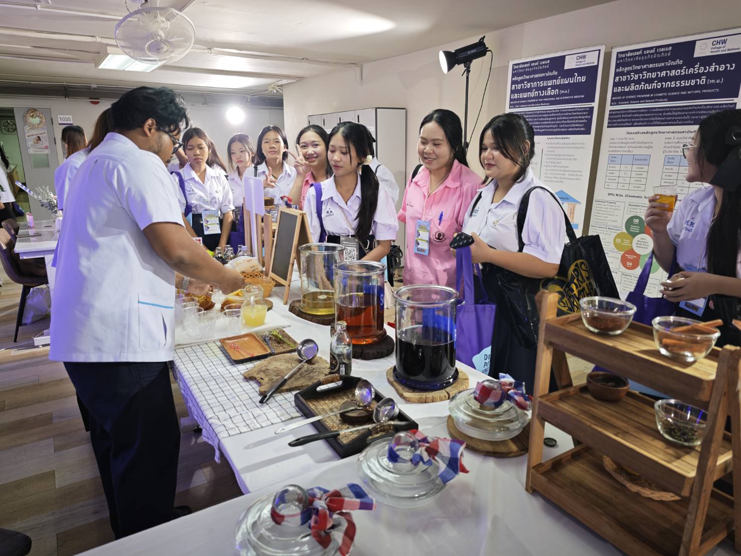 กิจกรรมทุกฐานถูกออกแบบให้สอดคล้องกับหัวใจของหลักสูตร ที่มุ่งให้นักศึกษาเข้าใจสมุนไพรไทยอย่างครบวงจร ครอบคลุม 3 แกนหลัก ได้แก่ เวชกรรม สมุนไพรและเภสัชกรรมไทย และหัตถกรรมการแพทย์แผนไทย ภายในงานยังมีบูธจัดแสดงผลิตภัณฑ์ต้นแบบ เช่น เอสเซนส์ โลชั่น เซรั่ม สครับ และผงสมุนไพรหลากหลายสูตร เพื่อให้ผู้เข้าร่วมเห็นภาพรวมอุตสาหกรรมด้านสุขภาพและความงามอย่างชัดเจน ได้เข้าใจว่าการแพทย์แผนไทยและงานสมุนไพรสามารถต่อยอดสู่ผลิตภัณฑ์ที่จับต้องได้จริงในหลากหลายรูปแบบ
