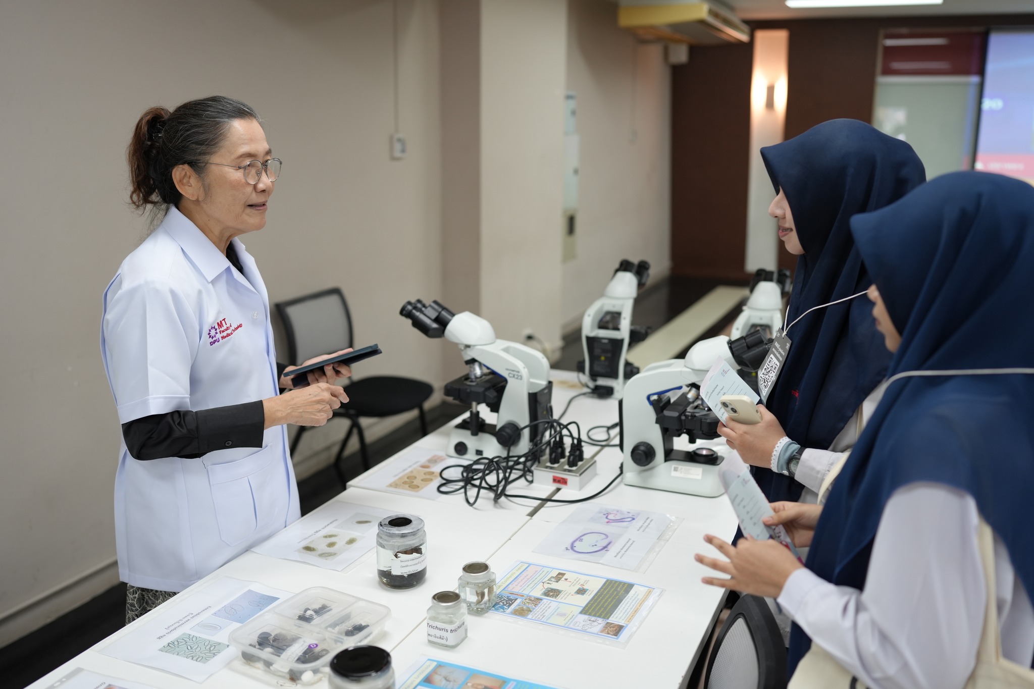ส่วนคณะเทคนิคการแพทย์ ได้เปิดโลกห้องแล็บทางการแพทย์ให้นักเรียนได้สัมผัสอย่างใกล้ชิด ผ่านกิจกรรม 4 ฐาน ได้แก่ ฐานโลหิตวิทยา ทดลองเจาะเลือดและตรวจหมู่เลือด ฐานบริการโลหิต เรียนรู้กระบวนการเตรียมเลือดให้ผู้ป่วย ฐานปรสิตวิทยา ดูตัวอย่างพยาธิและเชื้อมาลาเรียใต้กล้อง และฐานจุลชีววิทยา ฝึกส่องแบคทีเรีย–เชื้อรา รวมถึงเทคนิค Streak Plate ซึ่งหลังจบกิจกรรม นักเรียนได้ร่วมเล่นเกม Kahoot ชิงรางวัล พร้อมรับ e-certificate ผ่านระบบออนไลน์ โดยมีอาจารย์และรุ่นพี่ปี 1 คอยให้คำแนะนำ หลายคนให้ความเห็นว่า การได้เห็นพยาธิ เชื้อรา และจุลชีพแบบของจริง ช่วยให้เข้าใจการทำงานของนักเทคนิคการแพทย์มากขึ้น และรู้สึกสนใจในสาขาวิชาชีพนี้