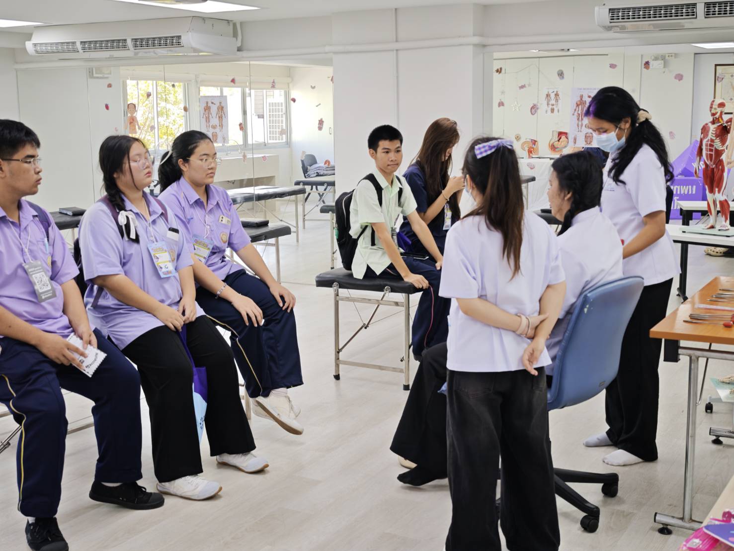 ในฝั่งของคณะกายภาพบำบัด กิจกรรมทดลองปฏิบัติได้รับความสนใจอย่างมากเช่นกัน โดยเริ่มจากการพาชมห้องปฏิบัติการทั้ง 3 ห้อง ที่ติดตั้งเครื่องมือกายภาพบำบัดนำเข้าจากต่างประเทศ เพื่อให้นักเรียนเห็นบรรยากาศการเรียนรู้จริง ก่อนเข้าสู่ฐานสาธิตการใช้อุปกรณ์ฟื้นฟู ที่อาจารย์ผู้เชี่ยวชาญสาธิตและให้นักเรียนได้ทดลองติดอุปกรณ์ด้วยตนเอง ฐานถัดมาคือการทดสอบการทรงตัวและสมรรถภาพร่างกาย ซึ่งแสดงให้เห็นบทบาทสำคัญของนักกายภาพบำบัดในการฟื้นฟูผู้ป่วย ทั้งผู้สูงอายุ ผู้บาดเจ็บ และนักกีฬา ปิดท้ายด้วยฐานเทคโนโลยีใหม่ ๆ พร้อมเทคนิคการรักษาและการส่งเสริมสุขภาพเชิงรุกที่กำลังเป็นกระแสในปัจจุบัน ช่วยให้ผู้เข้าร่วมเห็นภาพเส้นทางอาชีพในอนาคตได้อย่างครบถ้วน