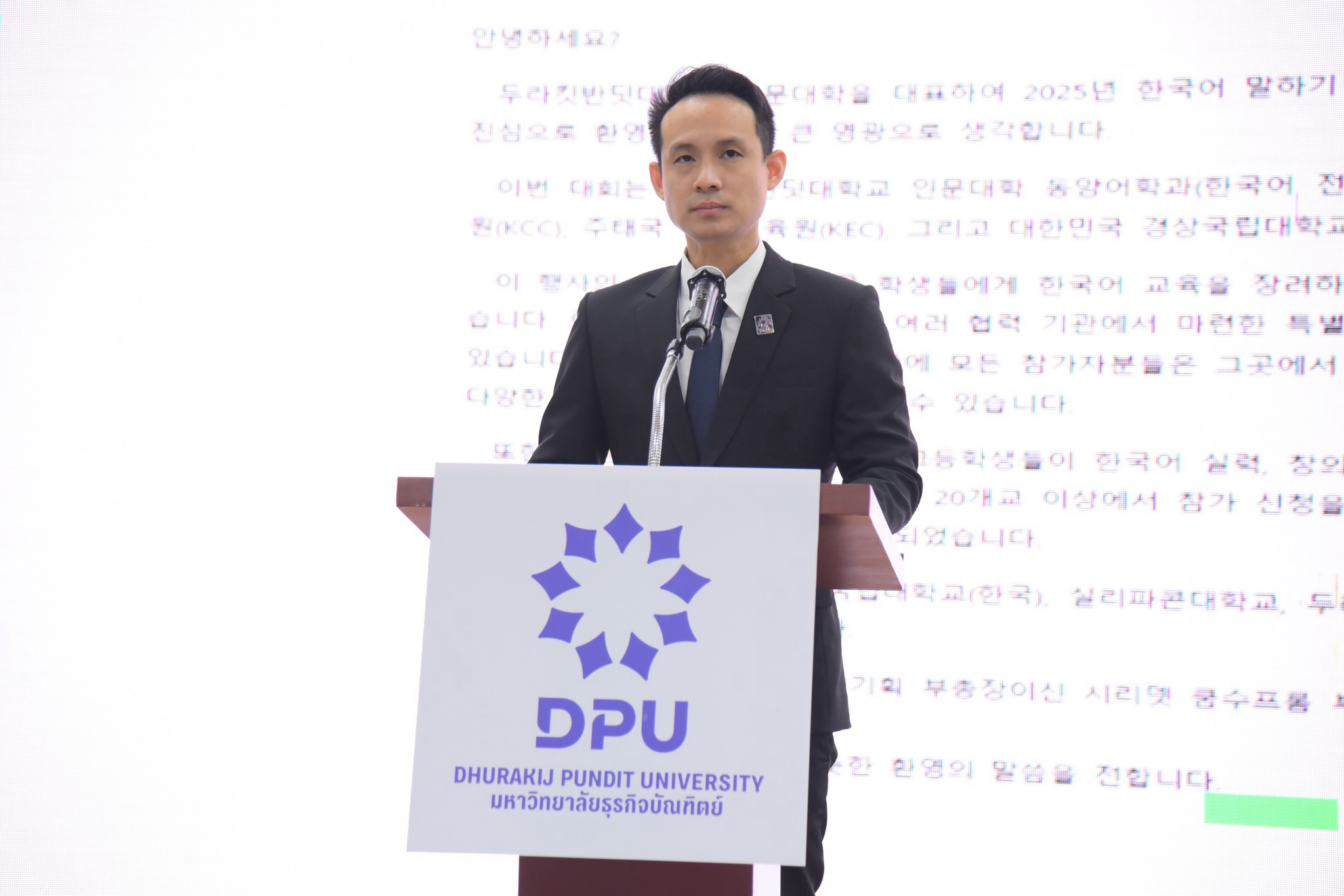 ดร.วริศ ลิ้มลาวัลย์ คณบดีคณะศิลปศาสตร์ มหาวิทยาลัยธุรกิจบัณฑิตย์ (DPU) กล่าวถึงเวทีเปิดการแข่งขันศักยภาพทางภาษา “Empowering Potential Language Communication” ครั้งที่ 1 ชิงถ้วยพระราชทานสมเด็จพระกนิษฐาธิราชเจ้า กรมสมเด็จพระเทพรัตนราชสุดาฯ สยามบรมราชกุมารี สำหรับนักเรียนระดับมัธยมศึกษาตอนปลายหรือเทียบเท่าทั่วประเทศ