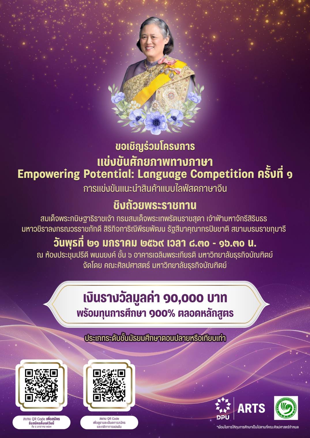 คณะศิลปศาสตร์ มหาวิทยาลัยธุรกิจบัณฑิตย์ (DPU) เปิดตัวโครงการการแข่งขันศักยภาพทางภาษา “Empowering Potential Language Communication” ครั้งที่ 1 ชิงถ้วยพระราชทานสมเด็จพระกนิษฐาธิราชเจ้า กรมสมเด็จพระเทพรัตนราชสุดาฯ สยามบรมราชกุมารี เปิดเวทีให้นักเรียนมัธยมปลายหรือเทียบเท่าทั่วประเทศได้แสดงศักยภาพด้านภาษา 4 ภาษา ทั้งภาษาจีน ภาษาอังกฤษ ภาษาญี่ปุ่น และภาษาเกาหลี ผ่านโจทย์การใช้ภาษาเชิงประยุกต์ ตั้งแต่ไลฟ์สดขายสินค้า ประกวดสุนทรพจน์ การแสดงบทบาทสมมุติ ไปจนถึงออกแบบบูธทางวัฒนธรรม โดยไม่มีค่าใช้จ่ายในการสมัคร พร้อมลุ้นทุนการศึกษาต่อที่ DPU