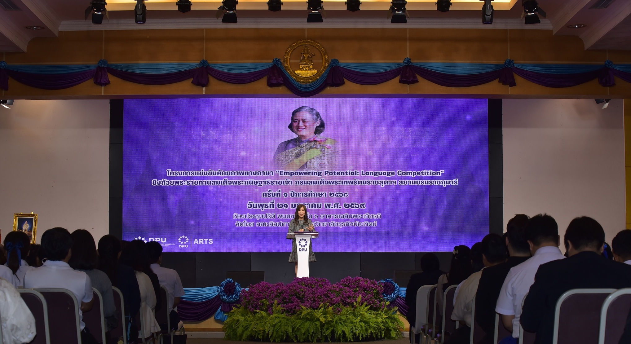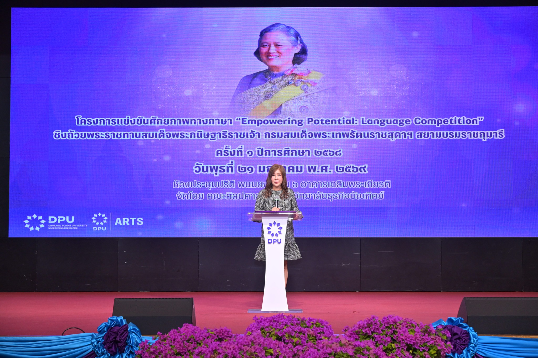 คณะศิลปศาสตร์ DPU เปิดเวทีประกวด “Empowering Potential Language Competition” ครั้งที่ 1 ดึงศักยภาพนักเรียน ม.ปลาย จากทั่วประเทศ โชว์ทักษะ 4 ภาษา “อังกฤษ-จีน-ญี่ปุ่น-เกาหลี” เชื่อมโลกธุรกิจและวัฒนธรรม ชิงถ้วยพระราชทานสมเด็จพระกนิษฐาธิราชเจ้า กรมสมเด็จพระเทพรัตนราชสุดาฯ พร้อมมอบทุนการศึกษาเต็มจำนวนให้ผู้ชนะเลิศ ผลักดันเป็นเวทีแสดงศักยภาพด้านภาษาระดับประเทศ เล็งจับมือพันธมิตรภายนอกร่วมจัดแข่งขันต่อเนื่องทุกปี