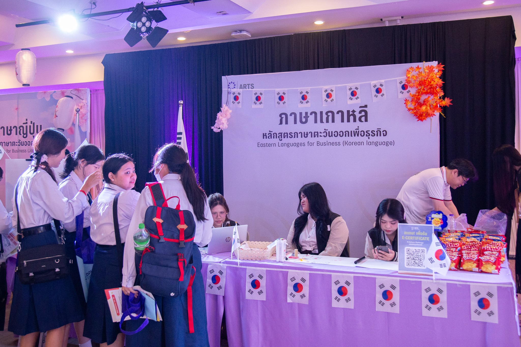 ขณะที่ คณะศิลปศาสตร์ ได้จัดกิจกรรม “เรียนภาษา ต้องเข้าใจวัฒนธรรม” ผ่าน 4 หลักสูตรด้านภาษา ได้แก่ จีน อังกฤษ ญี่ปุ่น และเกาหลี โดยออกแบบกิจกรรมให้ผู้เรียนสัมผัสอัตลักษณ์ของแต่ละภาษาอย่างเป็นรูปธรรม เช่น เกมค้นหาสัญลักษณ์วัฒนธรรมในเมืองจำลองญี่ปุ่น, เขียนตัวอักษรฮันกึล และซุ้มกิจกรรมสะท้อนวัฒนธรรมทั้ง 4 ภาษา ซึ่งไฮไลต์สำคัญคือการมีอาจารย์เจ้าของภาษาในทุกหลักสูตร รวมถึงมีเครือข่ายกับ ศูนย์การศึกษาเกาหลีประจำประเทศไทย (KEC) และศูนย์วัฒนธรรมเกาหลีประจำประเทศไทย (KCC) สถาบันขงจื่อเส้นทางสายไหมทางทะเล ในด้านการเรียนการสอนภาษาและวัฒนธรรม ทำให้ผู้เรียนมั่นใจว่าจะได้รับการเรียนการสอนคุณภาพสูง พร้อมโอกาสศึกษาต่อและทำงานในสายภาษาที่กว้างขึ้น