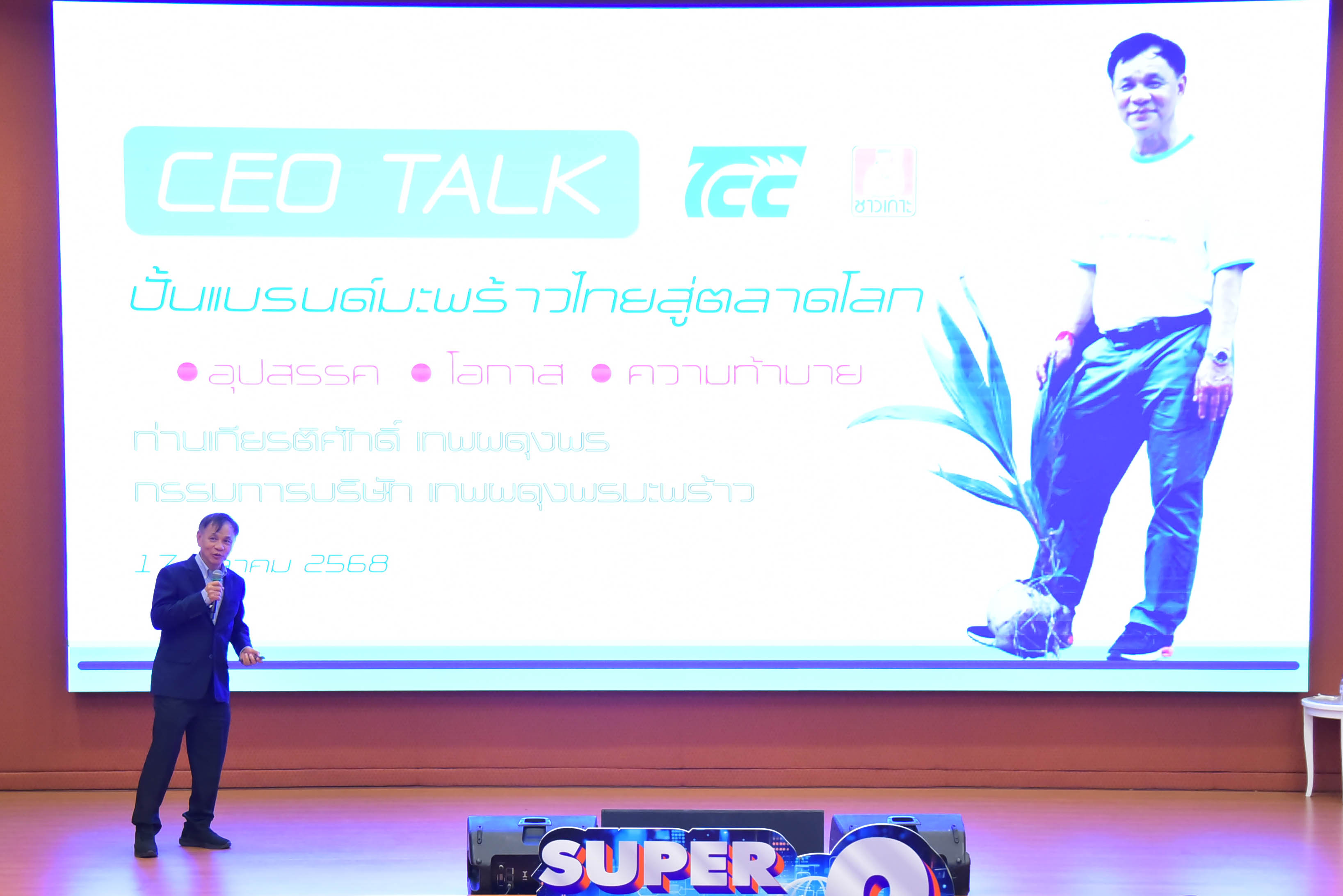 สำหรับช่วงสุดท้ายของกิจกรรม ปิดเวทีด้วยหัวข้อ CEO Talk โดย คุณเกียรติศักดิ์ เทพผดุงพร กรรมการบริหาร บริษัท เทพผดุงพรมะพร้าว จำกัด ได้ถ่ายทอดบทเรียนกลยุทธ์สำคัญ ที่ทำให้เขาเปลี่ยนผ่านธุรกิจครอบครัวสู่การขยายตลาดระดับโลก โดยคุณเกียรติศักดิ์เล่าถึงการเปลี่ยนผ่านครั้งสำคัญจากการค้าปลีกมาสู่การผลิตในระบบ อุตสาหกรรม ซึ่งเริ่มต้นจาก "กะทิถุง" เป็นผลิตภัณฑ์แรกที่บุกเบิกตลาด หลังจากนั้นบริษัทได้เริ่มขยายตลาดสู่ต่างประเทศ ควบคู่ไปกับการพัฒนานวัตกรรมบรรจุภัณฑ์ที่เน้นลดการใช้เหล็กและช่วยลดการปล่อยคาร์บอน เพื่อตอบโจทย์แนวคิดการพัฒนาที่ยั่งยืน