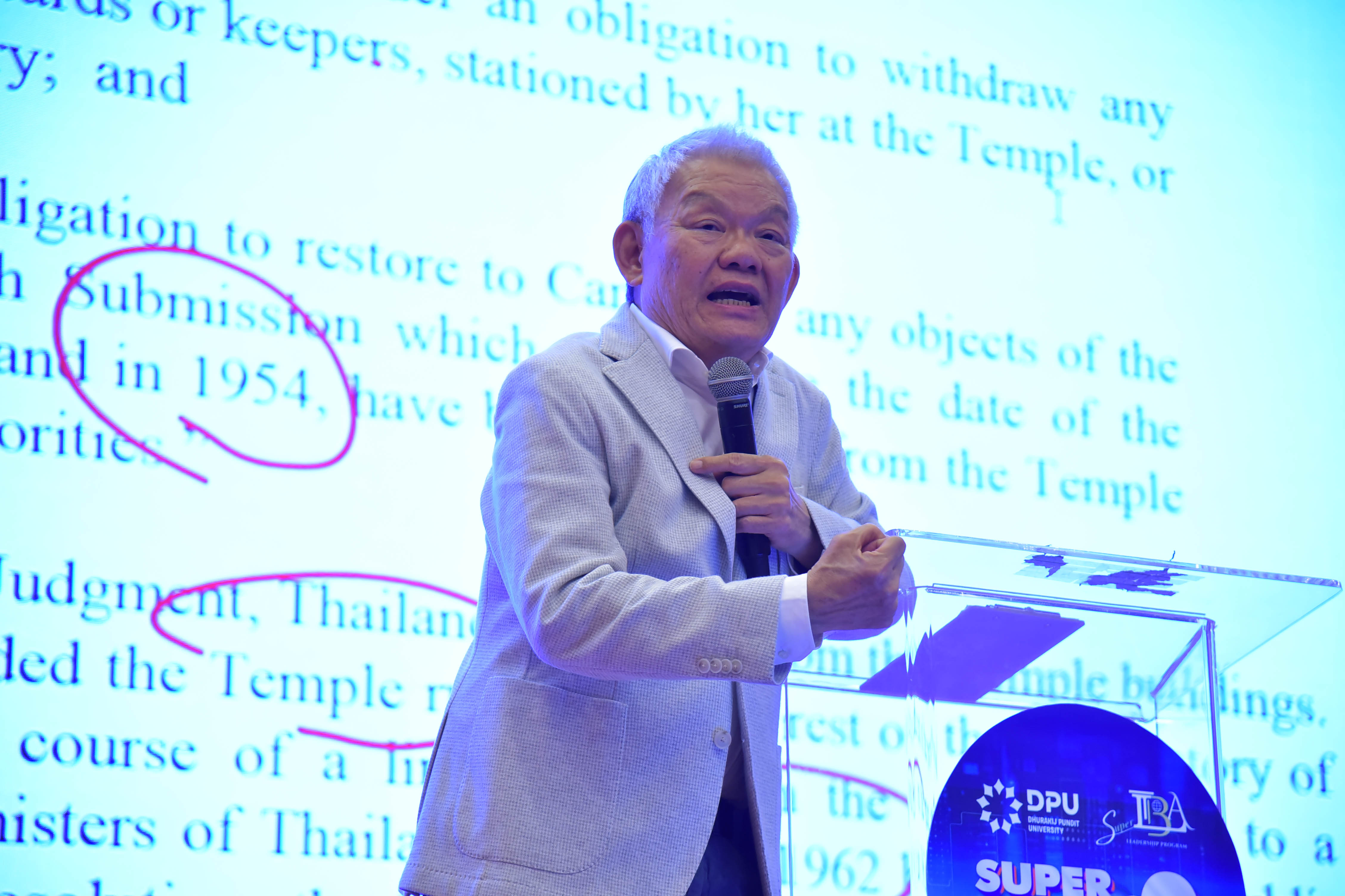กิจกรรมเริ่มต้นด้วยการบรรยายหัวข้อ “สัญญาธุรกิจระหว่างประเทศ: การบริหารความเสี่ยงและข้อพิพาท” โดย ศาสตราจารย์พิเศษ วิชัย อริยะนันทกะ อดีตผู้พิพากษาอาวุโสศาลทรัพย์สินทางปัญญาและการค้าระหว่างประเทศกลาง ซึ่งเน้นย้ำถึง “ความจำเป็นเร่งด่วน” ที่ผู้บริหารยุคใหม่ต้องเข้าใจการบริหารความเสี่ยงทางกฎหมาย โดยเฉพาะในเวทีระหว่างประเทศที่มีความซับซ้อนและค่าใช้จ่ายสูง