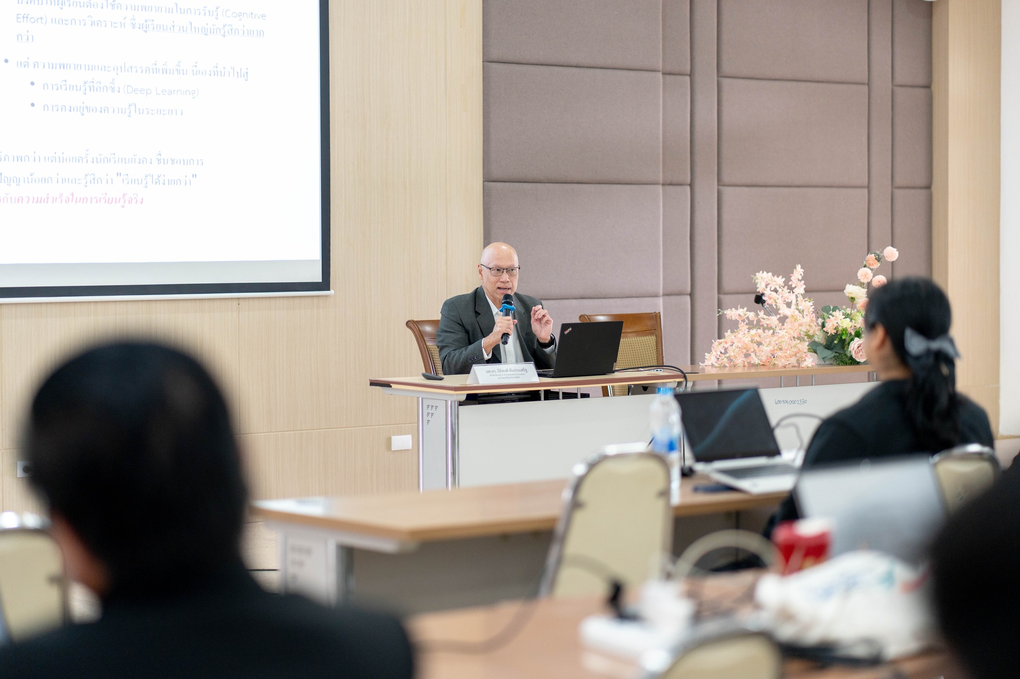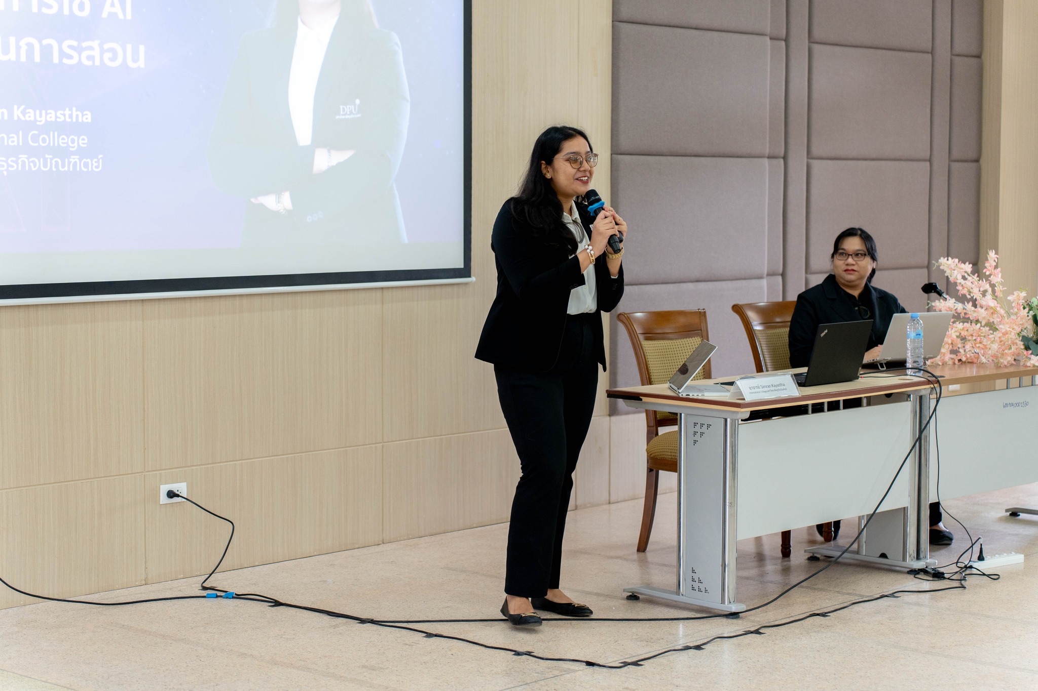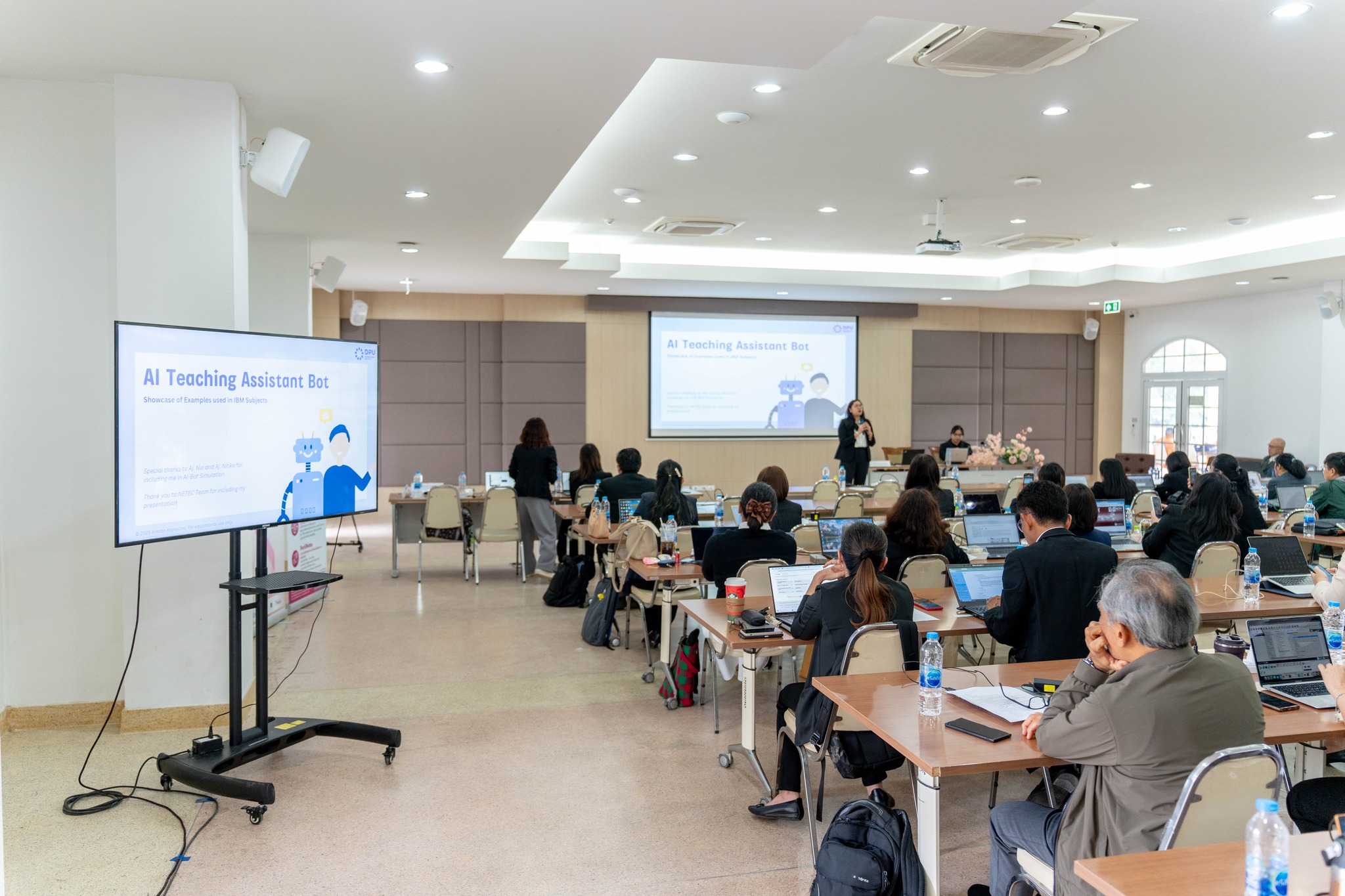 ภายในการอบรมยังมีการนำเสนอการใช้ “AI Teaching Assistance Bot” ในรายวิชา IBM โดย Miss Simran Kayastha รวมถึงการใช้ AI กระตุ้นการระดมความคิดในชั้นเรียน โดยคณาจารย์ DPU ได้นำแนวทางนี้ไปทดลองใช้งานแล้วกว่า 19 รายวิชา ครอบคลุม 10 หลักสูตร และสามารถผสานเข้ากับโครงสร้างเดิมของการเรียนการสอนได้อย่างราบรื่น ช่วยเสริมประสิทธิภาพทั้งในด้านการสอนและการเรียนรู้โดยไม่กระทบเป้าหมายหลักของแต่ละรายวิชา