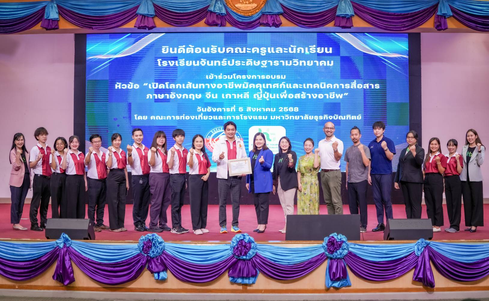 คณะการท่องเที่ยวและการโรงแรม มหาวิทยาลัยธุรกิจบัณฑิตย์ (DPU) จัดอบรมหัวข้อ “เปิดโลกเส้นทางอาชีพมัคคุเทศก์และเทคนิคการสื่อสาร ภาษาอังกฤษ จีน เกาหลี ญี่ปุ่น เพื่อสร้างอาชีพ” ให้กับคณะครูและนักเรียนแผนการเรียนเตรียมมนุษยศาสตร์ กลุ่มสาระการเรียนรู้ภาษาต่างประเทศ โรงเรียนจันทร์ประดิษฐารามวิทยาคม เมื่อวันที่ 5 สิงหาคม 2568 เพื่อส่งเสริมทักษะการใช้ภาษาต่างประเทศในบริบทงานบริการและการท่องเที่ยว เสริมทักษะศตวรรษที่ 21 และสร้างความร่วมมือระหว่างมหาวิทยาลัยกับโรงเรียนพันธมิตรผ่านกิจกรรมวิชาการ โดยมี ดร.ยุวรี โชคสวนทรัพย์ คณบดีคณะการท่องเที่ยวและการโรงแรม ตลอดจนคณาจารย์ให้การต้อนรับอย่างอบอุ่น ณ ห้องประชุมปรีดี พนมยงค์ อาคารเฉลิมพระเกียรติ มหาวิทยาลัยธุรกิจบัณฑิตย์