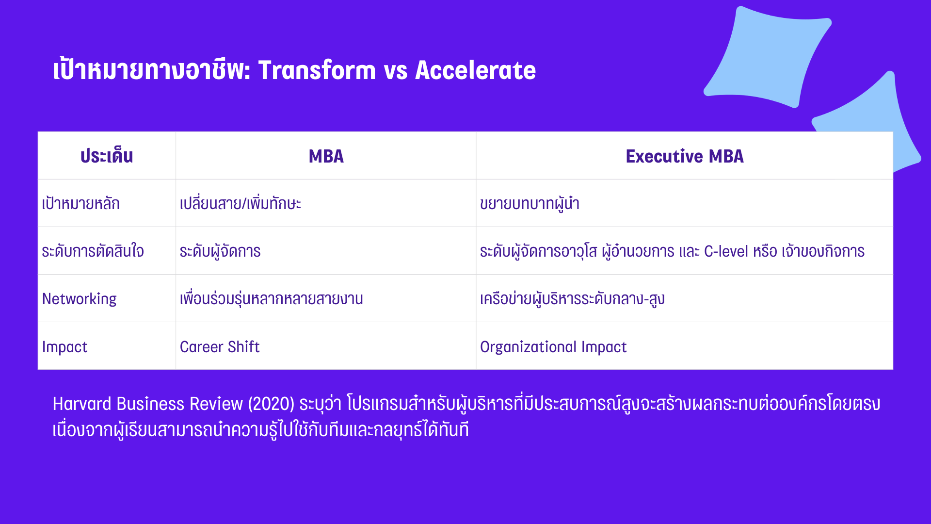 • หากคุณเป็นผู้บริหาร เจ้าของกิจการ หรือกำลังขยับสู่ระดับ C-level “Executive MBA จะตอบโจทย์เชิงกลยุทธ์มากกว่า”