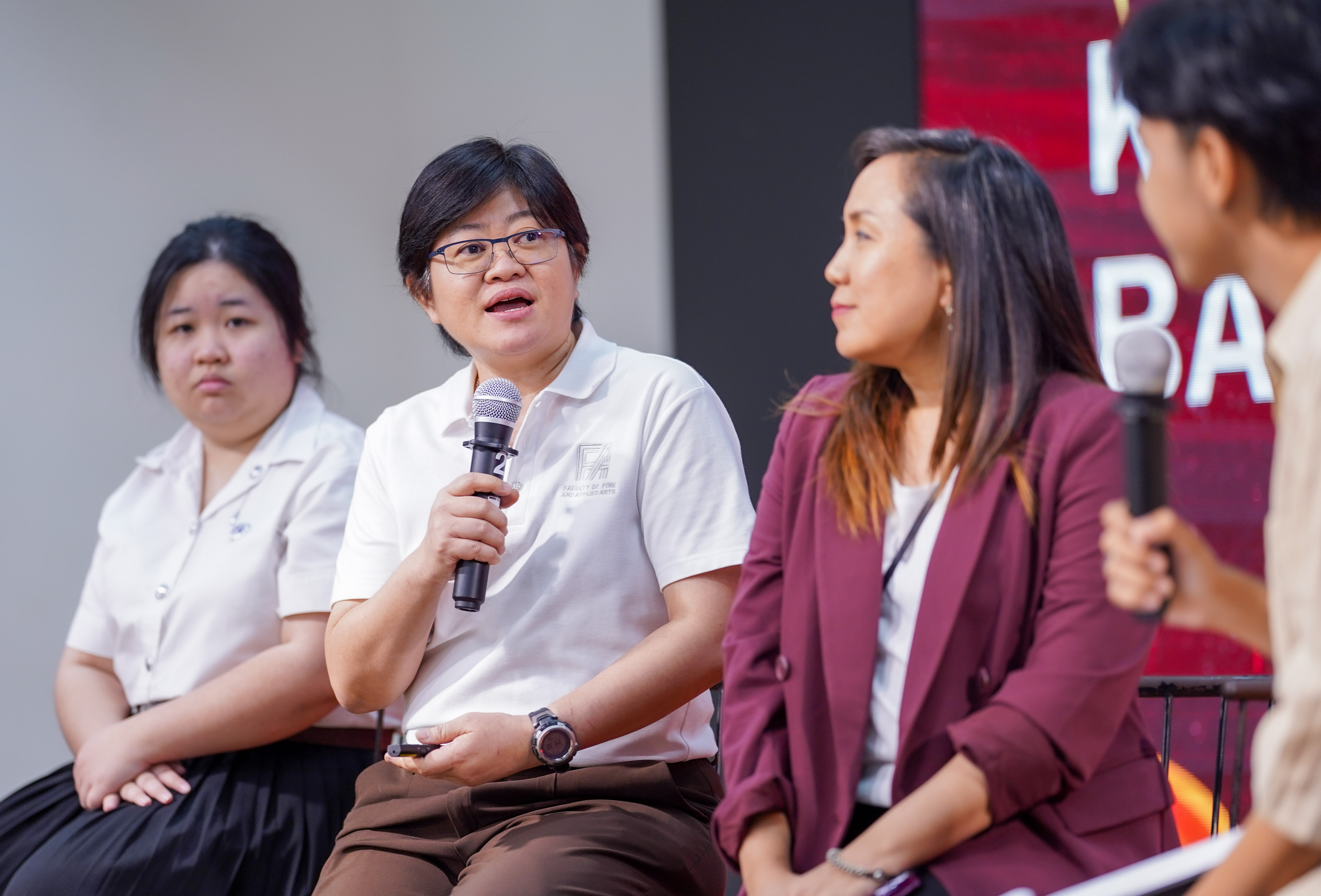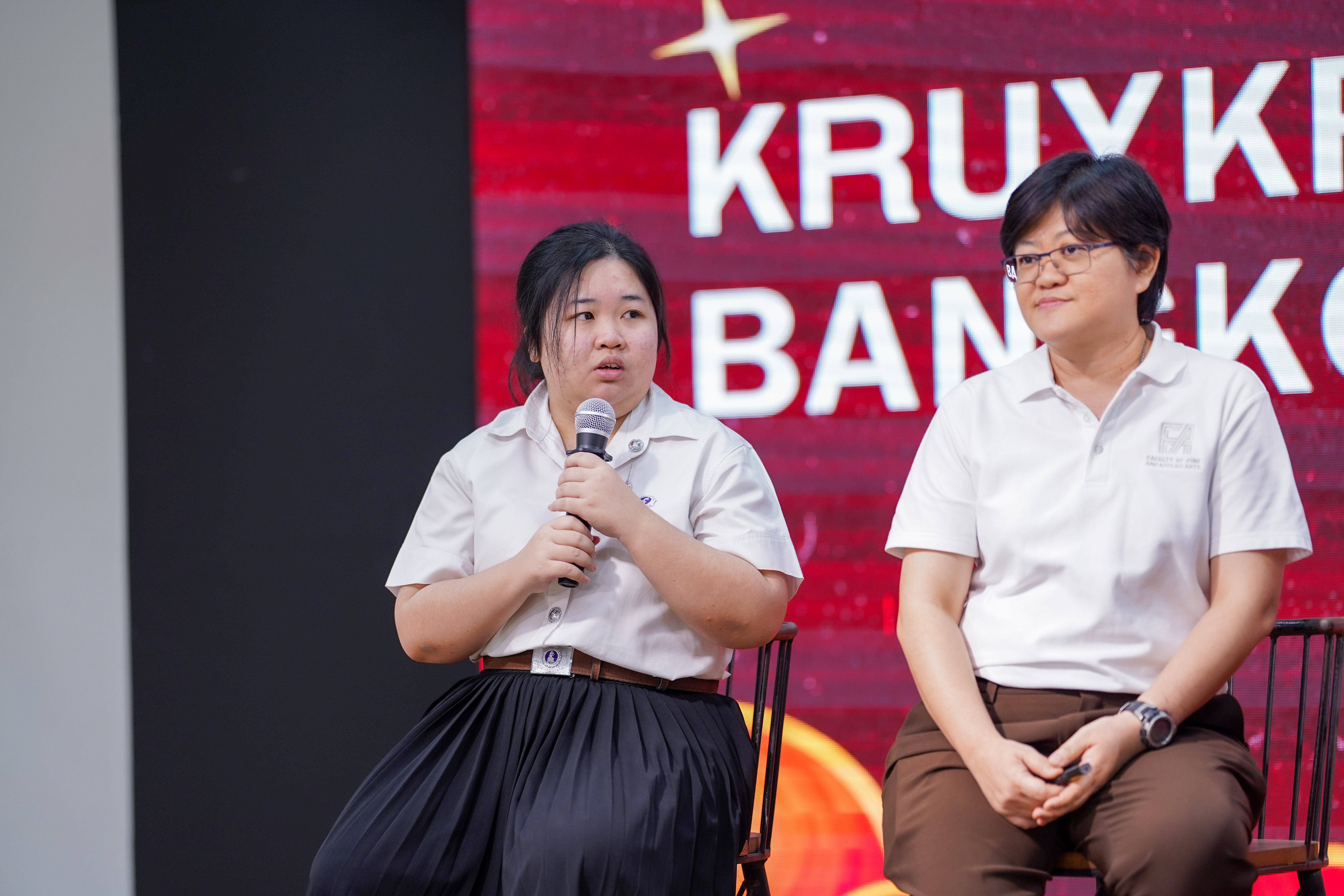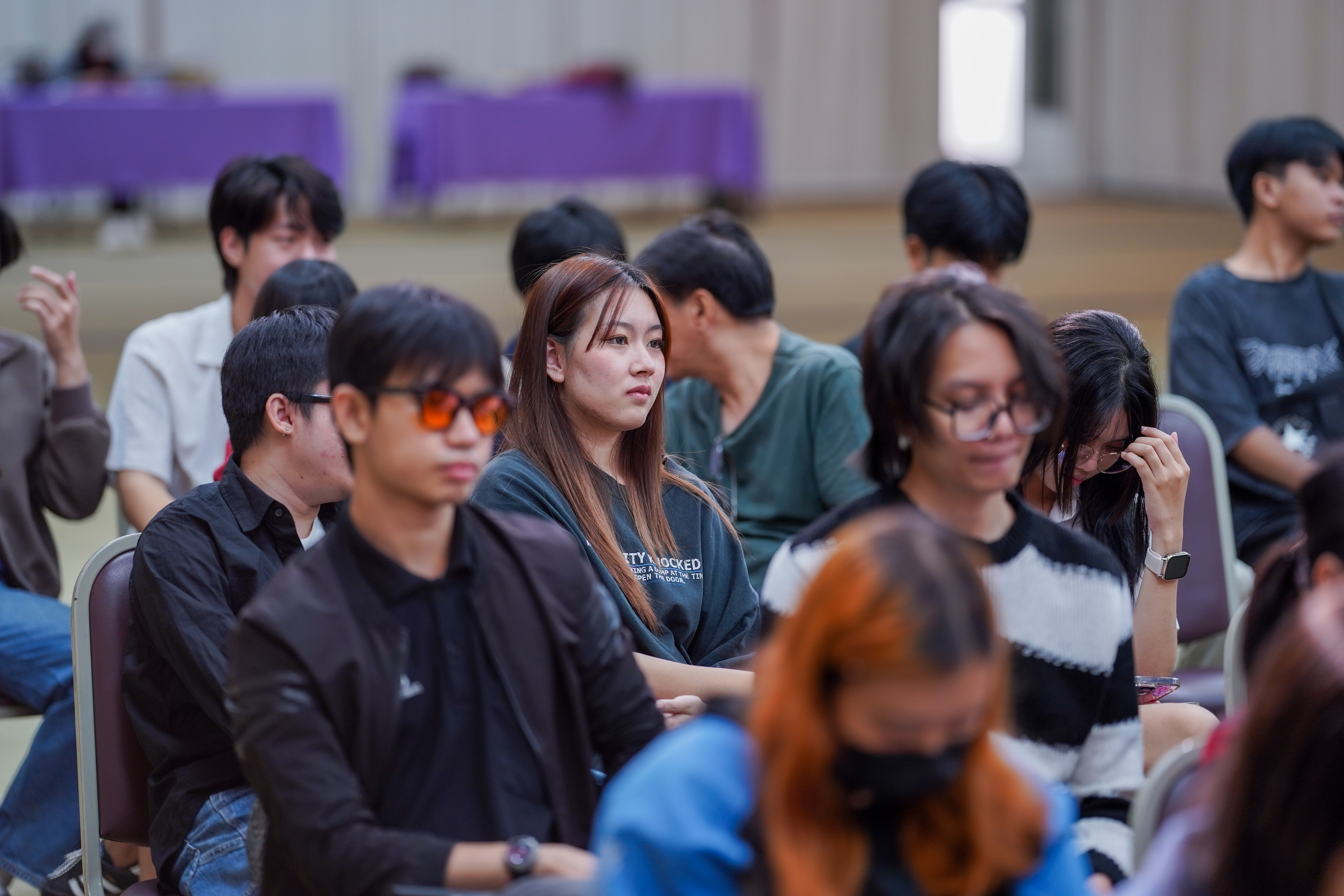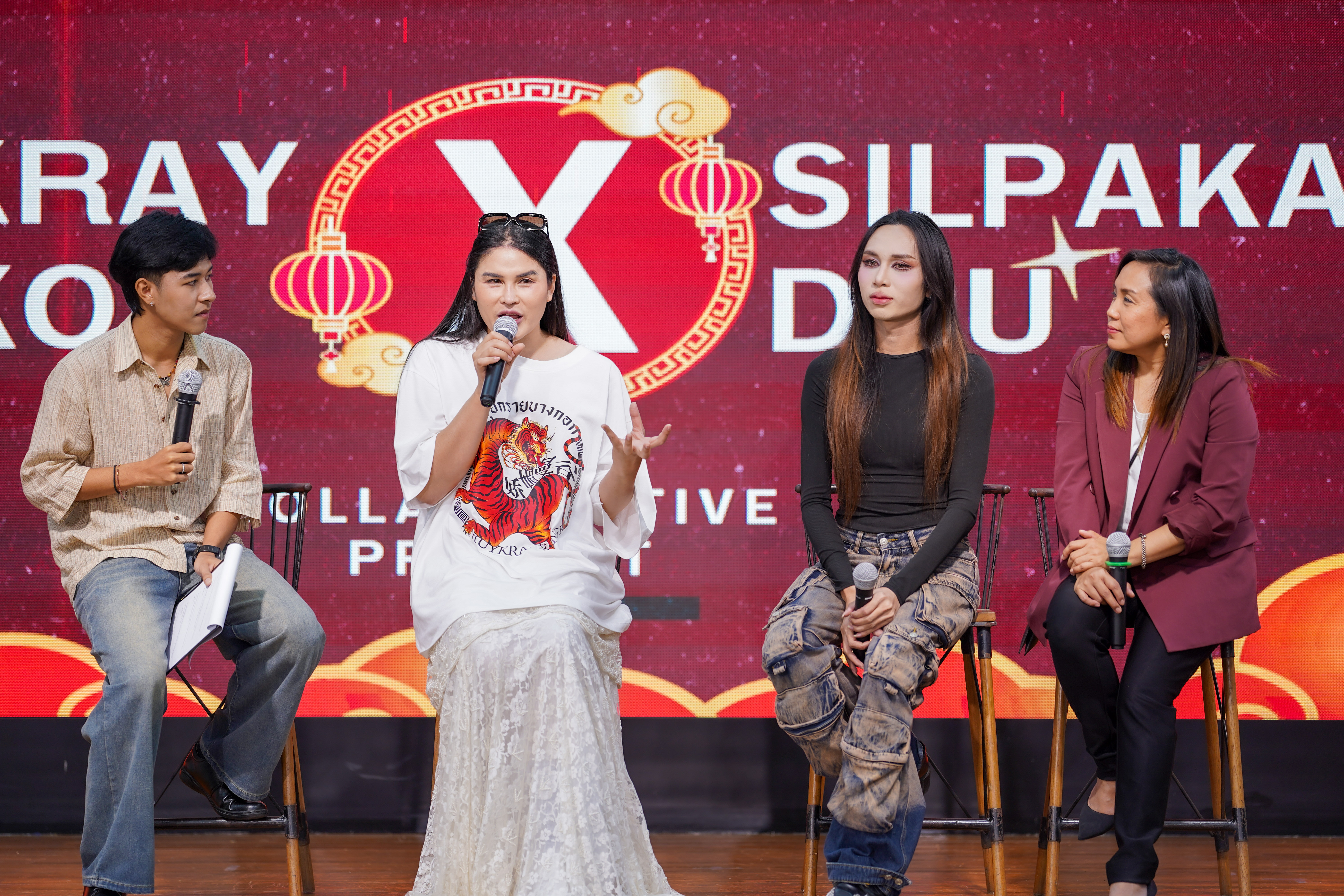 ส่วนการเสวนาพิเศษครั้งนี้ “คุณบิวตี้-บุญศักดิ์ ยุระตา” และ “คุณเบนซ์-อลัน วงศ์จันทร์คูณ” ได้มาเปิดใจแบ่งปันเรื่องราวเบื้องหลังการออกแบบที่น่าสนใจ โดยคุณบิวตี้ได้เล่าถึงจุดเริ่มต้นของแนวคิดคอลเลกชัน ‘เสวียนอู่’ ที่ได้แรงบันดาลใจจากเทพเจ้าจีน ซึ่งมีลักษณะเป็นเต่า ที่มีหัวเป็นงู ทำให้เกิดการต่อยอดแนวคิดไปสู่การค้นคว้าและประยุกต์ใช้ในงานออกแบบได้อย่างน่าสนใจ ซึ่งเต่าเป็นสัตว์ที่มีมากในมหาวิทยาลัย และงูเป็นปีนักษัตร 2568 ใช้สีน้ำตาลซึ่งเป็นสีประจำคณะศิลปกรรมศาสตร์ซึ่งตรงกับสี Mocha Moose ซึ่งเป็นสีเทรนด์จากค่าย Pantone ในปี 2025 พอดี จึงได้ผลงานตรุษจีนในโทนสีที่น่าสนใจและเปลี่ยนไปจากเดิม